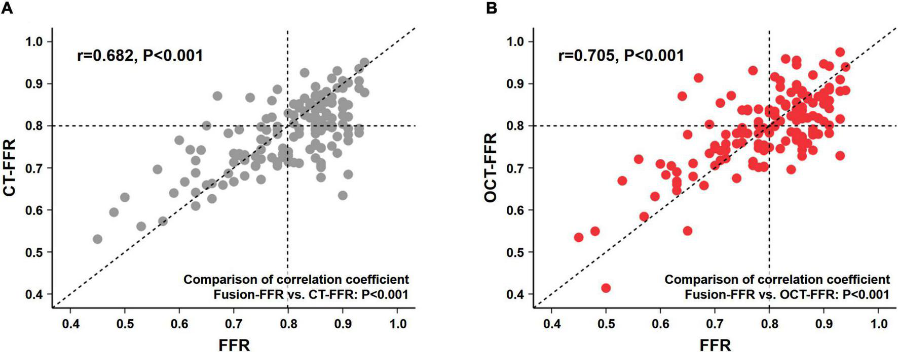 Correlation between pressure wire-based FFR and CFD-based computational FFR from coronary CTA or OCT images. Correlation between pressure wire-based FFR and CT-FFR (A), and between FFR and OCT-FFR (B). CFD, computational fluid dynamics; CTA, computed tomography angiography; CT-FFR, computational FFR from coronary CTA; FFR, fractional flow reserve; OCT, optical coherence tomography; OCT-FFR, computational FFR from OCT.