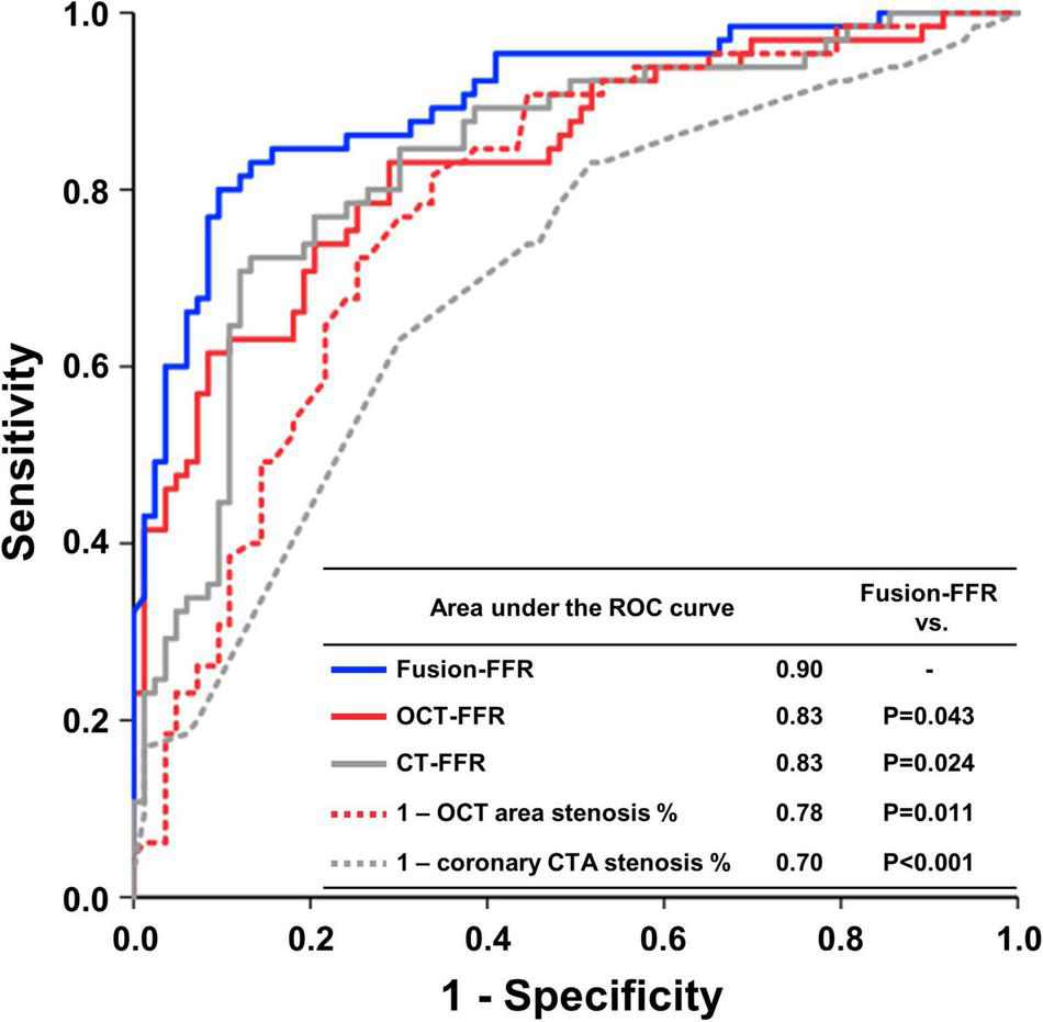 Fusion-FFR was strongly correlated with FFR (r = 0.836, P < 0.001). Correlation between FFR and Fusion-FFR was stronger than that between FFR and CT-FFR (r = 0.682, P < 0.001; z statistic, 5.42, P < 0.001) and between FFR and OCT-FFR (r = 0.705, P < 0.001; z statistic, 4.38, P < 0.001). Area under the receiver operating characteristics curve to assess functionally significant stenosis was higher for Fusion-FFR than for CT-FFR (0.90 vs. 0.83, P = 0.024) and OCT-FFR (0.90 vs. 0.83, P = 0.043). Fusion-FFR exhibited 84.5% accuracy, 84.6% sensitivity, 84.3% specificity, 80.9% positive predictive value, and 87.5% negative predictive value. Especially accuracy, specificity, and positive predictive value were superior for Fusion-FFR than for CT-FFR (73.0%, P = 0.007; 61.4%, P < 0.001; 64.0%, P < 0.001) and OCT-FFR (75.7%, P = 0.021; 73.5%, P = 0.020; 69.9%, P = 0.012).