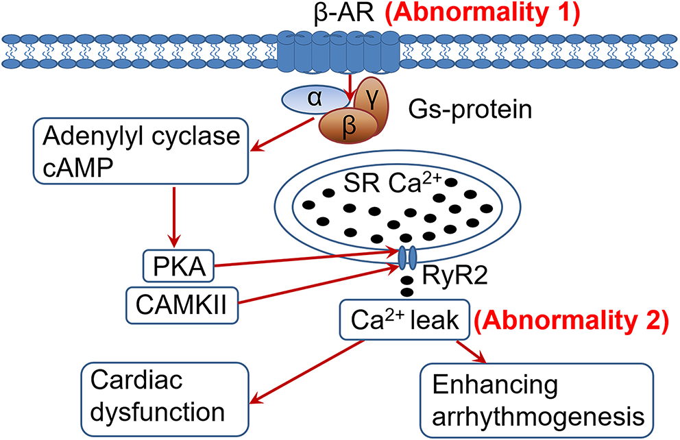 β-adrenergic receptor, β-adrenergic receptor desensitization/down-regulation, cardiac ryanodine receptor, calcium leak, arrhythmia, heart failure