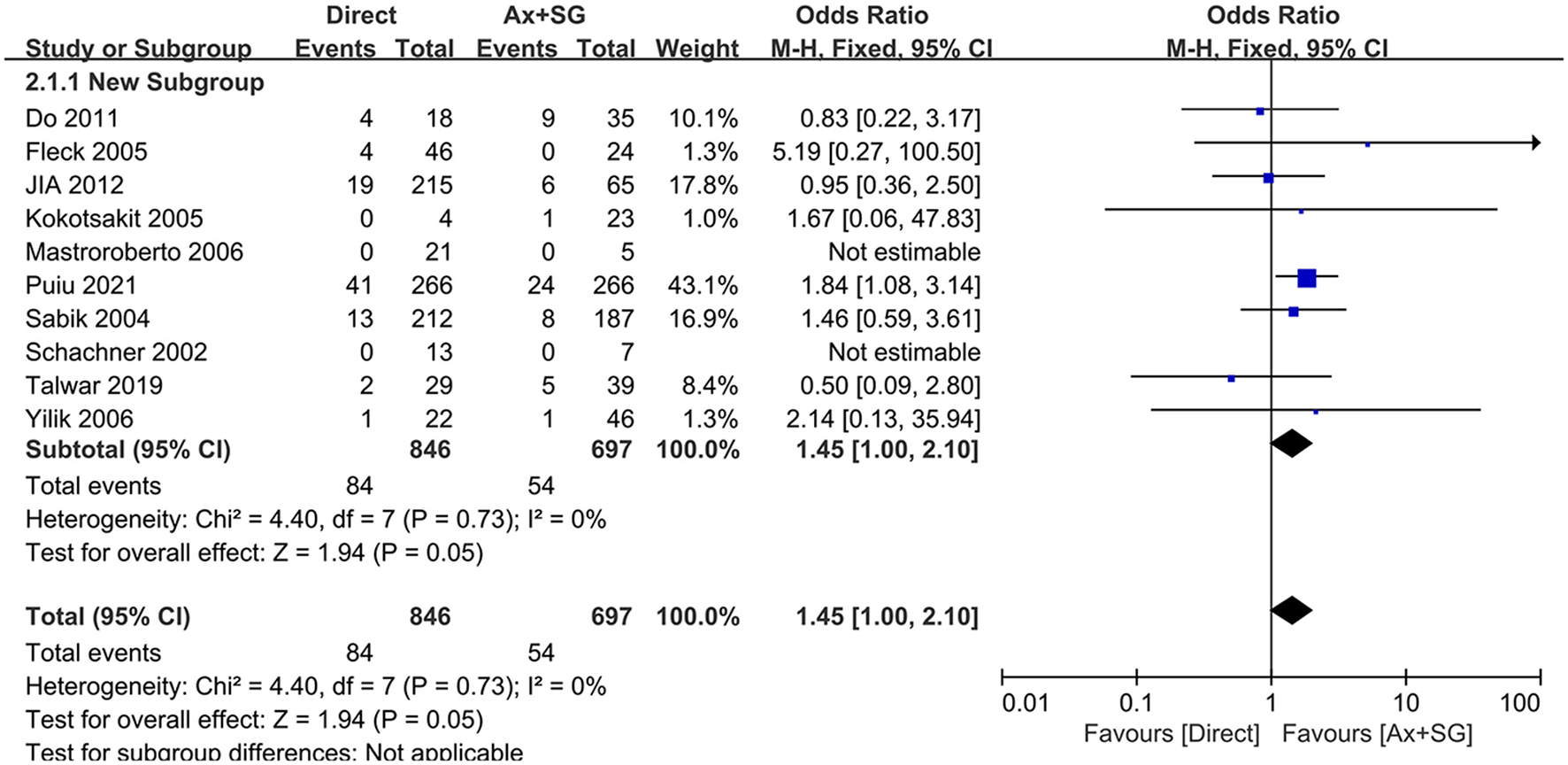 Neurological dysfunction was reported in ten studies, and A meta-analysis of data revealed that the pooled mortality incidence was 10.0% malperfusion, compared to 7.6% in the Ax+SG group. Figure 2 shows a difference in neurological dysfunction reaching statistical significance [odds ratio, 1.45, 95% CI (1.00, 2.10), χ2 = 4.40, P = 0.05]. The test for heterogeneity was low and not statistically significant (I2 = 0; P = 0.73), which revealed the validity of the pooling data.