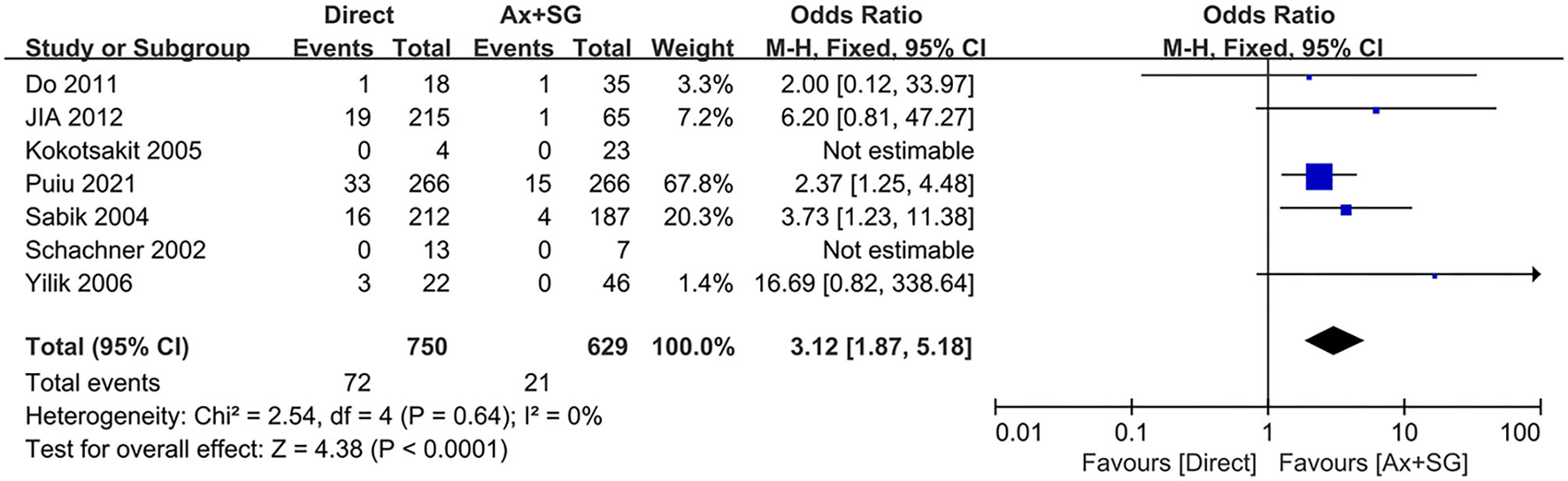 Cannulation-related complications were reported in seven studies. The pooled cannulation-related complications rate in the direct cannulation group was 9.6% when compared with 3.3% in the Ax+SG group. As shown in Figure 3, differences of cannulation-related complications reach statistical significance [odds ratio, 3.12, 95% CI (1.87, 5.18), χ2 = 2.54, P < 0.0001]. The test for heterogeneity was low and not statistically significant (I2 = 0; P = 0.64), which indicates the validity of the pooling data.