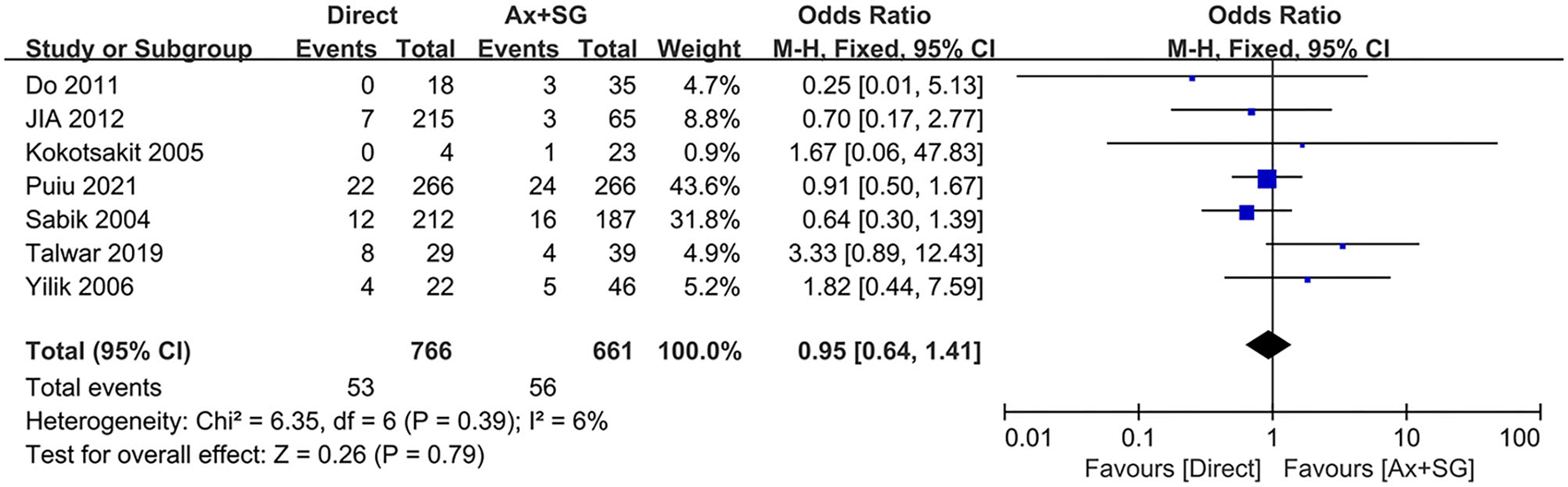 The difference in postoperative mortality was extracted from 7 studies. The pooled postoperative mortality incidence between direct cannulation group was 6.9%, which was not statistically significant compared to 8.5% in the SGAC group [probability ratio, 0.95, 95% CI (0.64, 1.41), χ2 = 6.35, P = 0.79], shown in Figure 4. The test of heterogeneity was not statistically significant (I2 = 6%, P = 0.39).