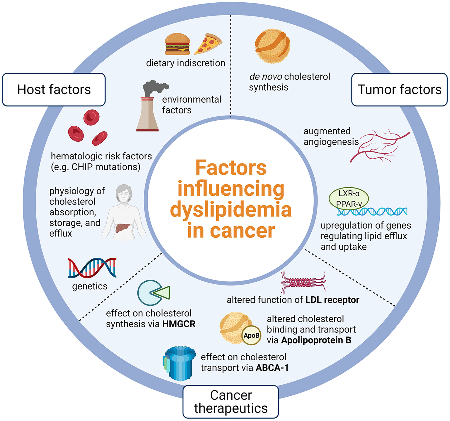Host factors such as physiology and lifestyle, tumor factors that promote lipid dysregulation, and nuances of cancer therapeutics likely influence dyslipidemia in cancer. Dyslipidemia in cancer is likely due to host physiology and lifestyle, tumor processes that promote lipid dysregulation, and effects of cancer therapeutics on key points of lipid metabolism. CHIP, Clonal hematopoiesis of indeterminate potential; LXR-alpha, Liver X receptor alpha; PPAR-gamma, Peroxisome-proliferator activated receptor gamma; LDL, Low density lipoprotein; HMGCR, 3-hydroxy-3-methylglutaryl coenzyme A reductase; ABCA-1, Adenosine triphosphate binding cassette subfamily A member 1; Created using Biorender.com.