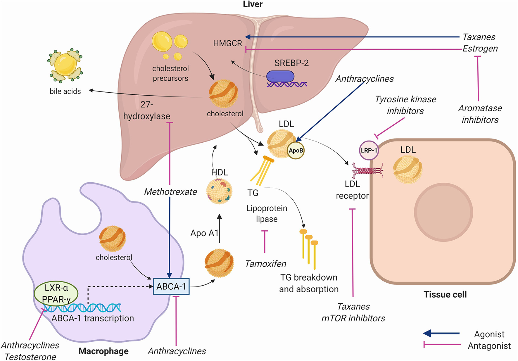 Key receptors and enzymes in cholesterol physiology targeted by chemotherapeutic agents. Anthracyclines inhibit adenosine triphosphate binding cassette subfamily A member 1 (ABCA1) facilitated-transport of cholesterol from cells to high density lipoprotein (HDL), inhibit liver X receptor alpha (LXR-alpha) and peroxisome-proliferator activated receptor gamma (PPAR-gamma) nuclear receptors that transcribe ABCA-1, and increase Apolipoprotein B. Taxanes increase 3-hydroxy-3-methylglutaryl coenzyme A reductase (HMGCR), inhibit Apolipoprotein B, and inhibit low density lipoprotein (LDL) receptor expression. Tyrosine kinase inhibitors (TKIs) inhibit LDL-receptor-related protein (LRP-1). Mammalian target of rapamycin (mTOR) inhibitors inhibit LDL receptors. Methotrexate alters expression of ABCA-1 and 27-hydroxylase. Aromatase inhibitors reduce estrogen function. Estrogen inhibits hepatic HMGCR and reduces cholesterol synthesis. Testosterone inhibits LXR-alpha and PPAR-gamma. Tamoxifen inhibits lipoprotein lipase reducing triglyceride breakdown. Apo A1, Apolipoprotein A1; SREBP-2, sterol regulatory element binding transcription factor 2; TG, Triglycerides. Created using Biorender.com.