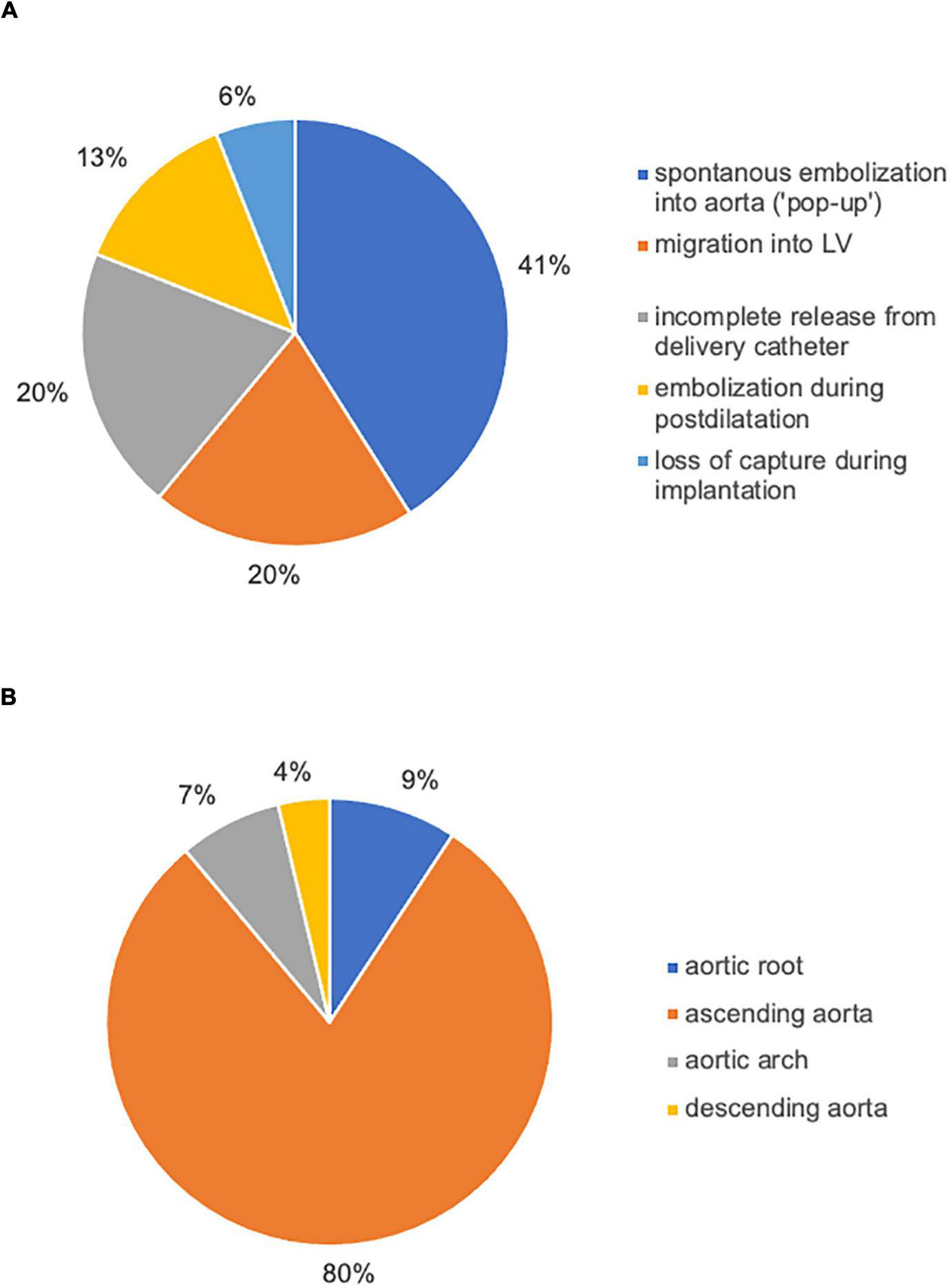 Causes of TVEM and the final position of embolized valves left in situ. Review of procedural records and angiograms identified five main mechanisms of TVEM during TAVI (A). In the majority of cases, the embolized THV was left in the ascending aorta (B).
