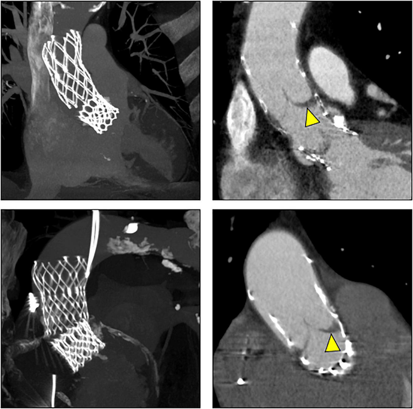 54 TVEM occurred in 3757 TAVI procedures, 46 cases were managed percutaneously. Horizontal aorta (odds ratio [OR] 7.51, 95% confidence interval [CI] 3.4–16.6, p < 0.001), implantation of a self-expanding valve (OR 4.63, 95% CI 2.2–9.7, p < 0.01) and a left ventricular ejection fraction < 40% (OR 2.94, 95% CI 1.1–7.3, p = 0.016) were identified as risk factors for TVEM. CT scans were performed on average 26.3 months after TAVI (range 2–84 months) and detected hypoattenuated leaflet thickening (HALT) in two patients as well as parts of the stent frame protruding into the aortic wall in three patients.