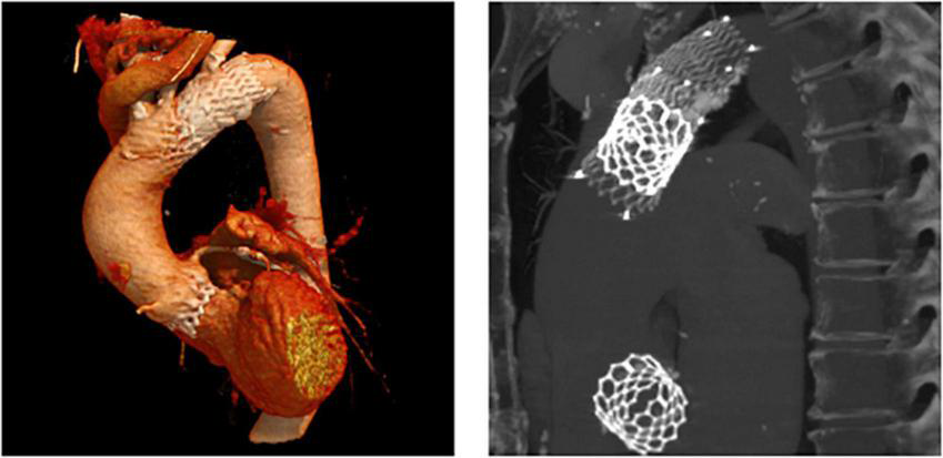 Subclinical leaflet thrombosis characterized by hypoattenuated leaflet thickening (HALT) is a frequent finding in transcatheter bioprosthetic aortic valves with a prevalence of up to 28% in short- and long-term CT follow-up (4, 5, 14). To our knowledge, our study is the first to systematically examine embolized valves by CT after mid- to long-term follow-up. HALT was detected in the embolized valves in two TVEM patients (Figure 2). Since the number of patients in our imaging sub-study is low it is not possible to draw definite conclusions. Of note, both patients with HALT did not take oral anticoagulants which have been shown to prevent the formation of leaflet thrombosis. In addition, our findings advise some caution as parts of the upper crown of embolized self-expanding valves protruding into the aortic wall were observed in three patients (Figure 3). This is reminiscent of another case from our TVEM cohort complicated by valve embolization due to pop-up of a 25 mm Portico self-expanding valve. The embolized valve was snared and pulled into the ascending aorta to avoid coronary obstruction. After successful implantation of a second transcatheter valve (23 mm Edwards Sapien 3) the patient developed hemorrhagic shock. Angiography revealed perforation of the ascending aorta by a part of the upper crown of the THV protruding through the aortic wall. The valve was surgically removed, and the ascending aorta repaired on cardiopulmonary bypass (Figure 6). Accordingly, interventionalists should be aware of this potential complication when embolized valves have to be actively pulled up into the ascending aorta using a snare. Patients should be examined by CT in a timely fashion to rule out perforation of the ascending aorta if they develop hemodynamic instability in the postinterventional course.