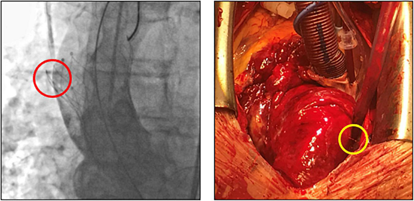 Fluoroscopic images and intraoperative situs after perforation of the ascending aorta by an embolized self-expanding valve. Fluoroscopy (left) and intraoperative situs (right) of a patient with hemorrhagic shock due to perforation (circles) of the ascending aorta. After embolization, the self-expanding valve (25 mm Portico) was deliberately pulled further into the ascending aorta to avoid coronary obstruction.