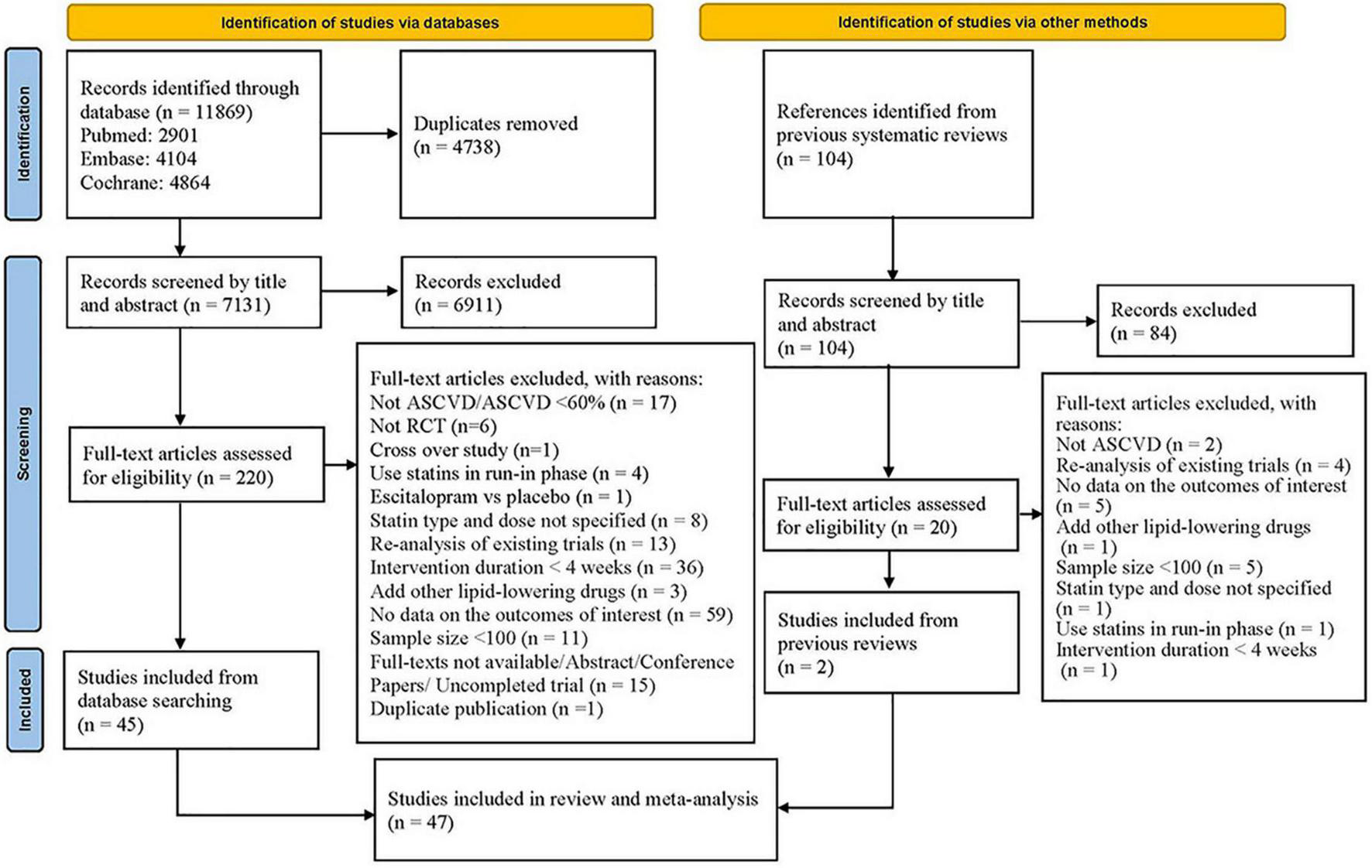 Studies were searched from PubMed, Embase and the Cochrane Database from their inception to October 2021. Also, we checked previous systematic reviews of clinical trials of statins to avoid omission. Supplementary Table 1 shows the detailed search strategies.