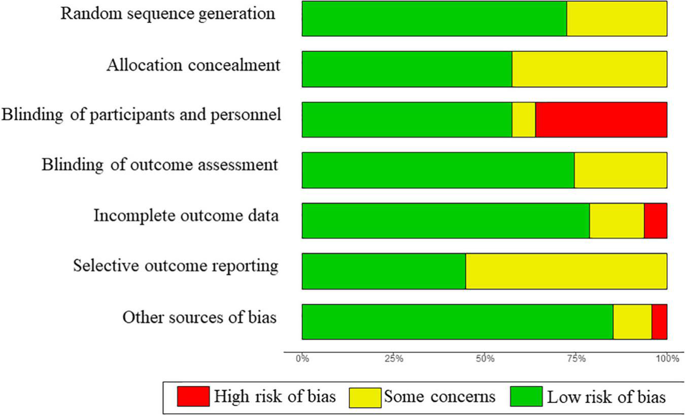 The overall risk of bias was rated as low or unclear in most studies (Figure 2). Twenty-six trials were double-blinded, and three did not state the blinding of participants and personnel. Seventeen trials were graded high risk regarding blind owing to the open-label design. The risk of bias in individual studies was described in Supplementary Table 4.