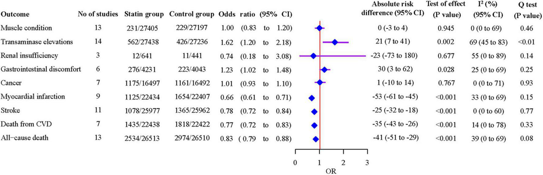 Associations of statins with safety and efficacy outcomes from pairwise meta-analyses.