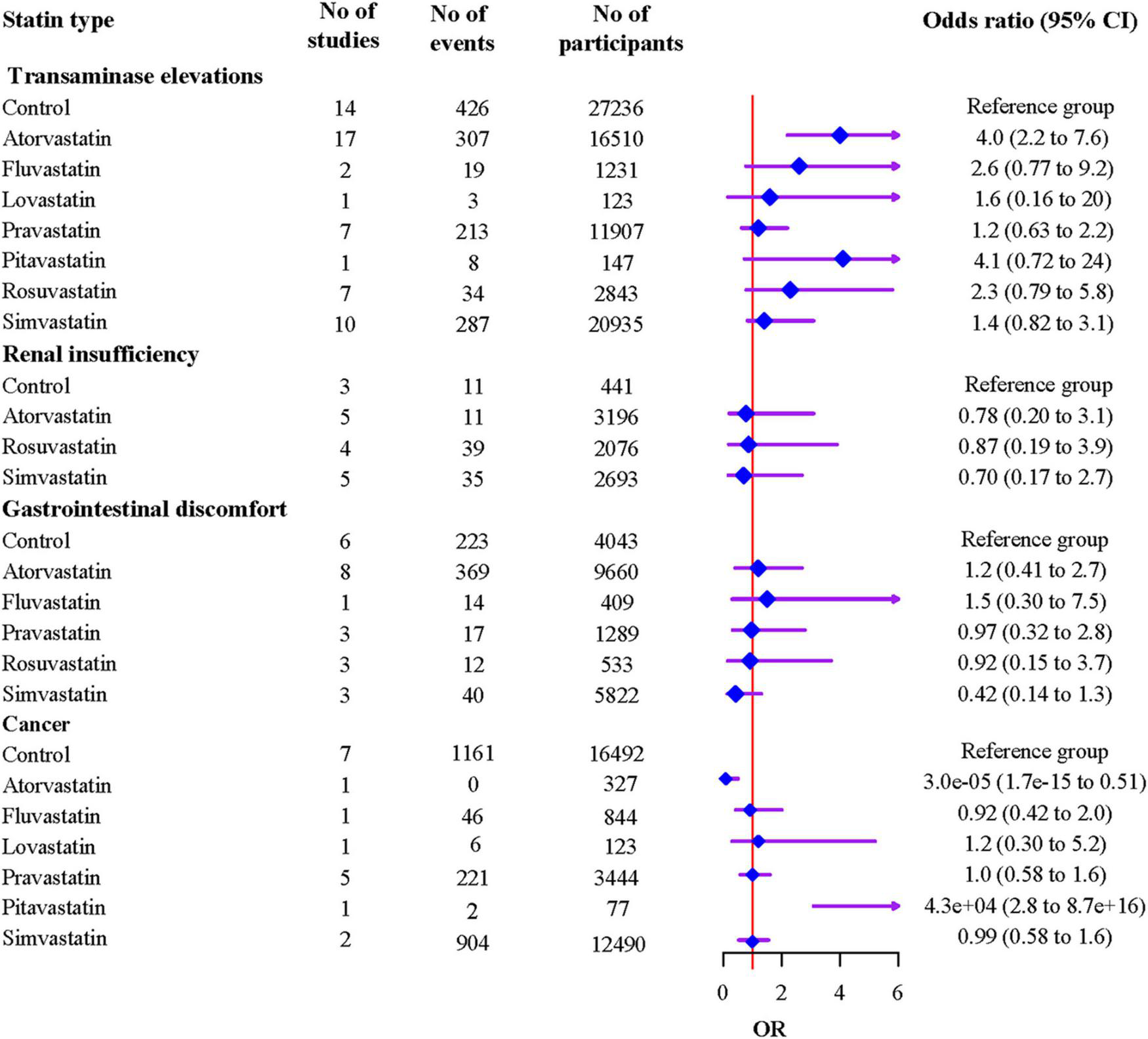Forty-seven trials involving 107,752 participants were enrolled and followed up for 4.05 years. Compared with non-statin control, statins were associated with an increased risk of transaminase elevations [OR 1.62 (95% CI 1.20 to 2.18)]. Statins decreased the risk of MI [OR 0.66 (95% CI 0.61 to 0.71), P < 0.001], stroke [OR 0.78 (95% CI 0.72 to 0.84), P < 0.001], death from CVD [OR 0.77 (95% CI 0.72 to 0.83), P < 0.001] and all-cause death [OR 0.83 (95% CI 0.79 to 0.88), P < 0.001]. Atorvastatin showed a higher risk of transaminase elevations than non-statin control [OR 4.0 (95% CI 2.2 to 7.6)], pravastatin [OR 3.49 (95% CI 1.77 to 6.92)] and simvastatin [OR 2.77 (95% CI 1.31 to 5.09)], respectively. Compared with atorvastatin, simvastatin was associated with a lower risk of muscle problems [OR 0.70 (95% CI 0.55 to 0.90)], while rosuvastatin showed a higher risk [OR 1.75 (95% CI 1.17 to 2.61)]. An Emax dose-response relationship was identified for the effect of atorvastatin on transaminase elevations.