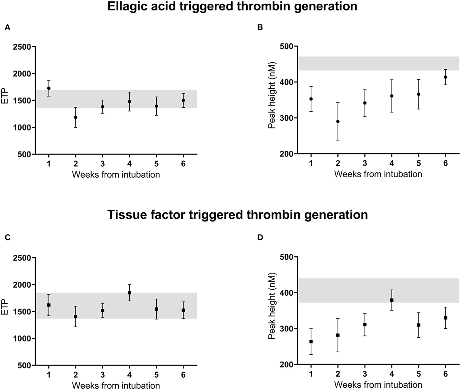 Thrombin generation ETP (A,C) and peak height (B,D) initiated by ellagic acid and tissue factor, unadjusted measurements over 6 weeks from intubation in critically ill patients with COVID-19 infection. Reference range of normal pooled plasma shown in gray. ETP, endogenous thrombin potential; EA, ellagic acid; TF, tissue factor, A.