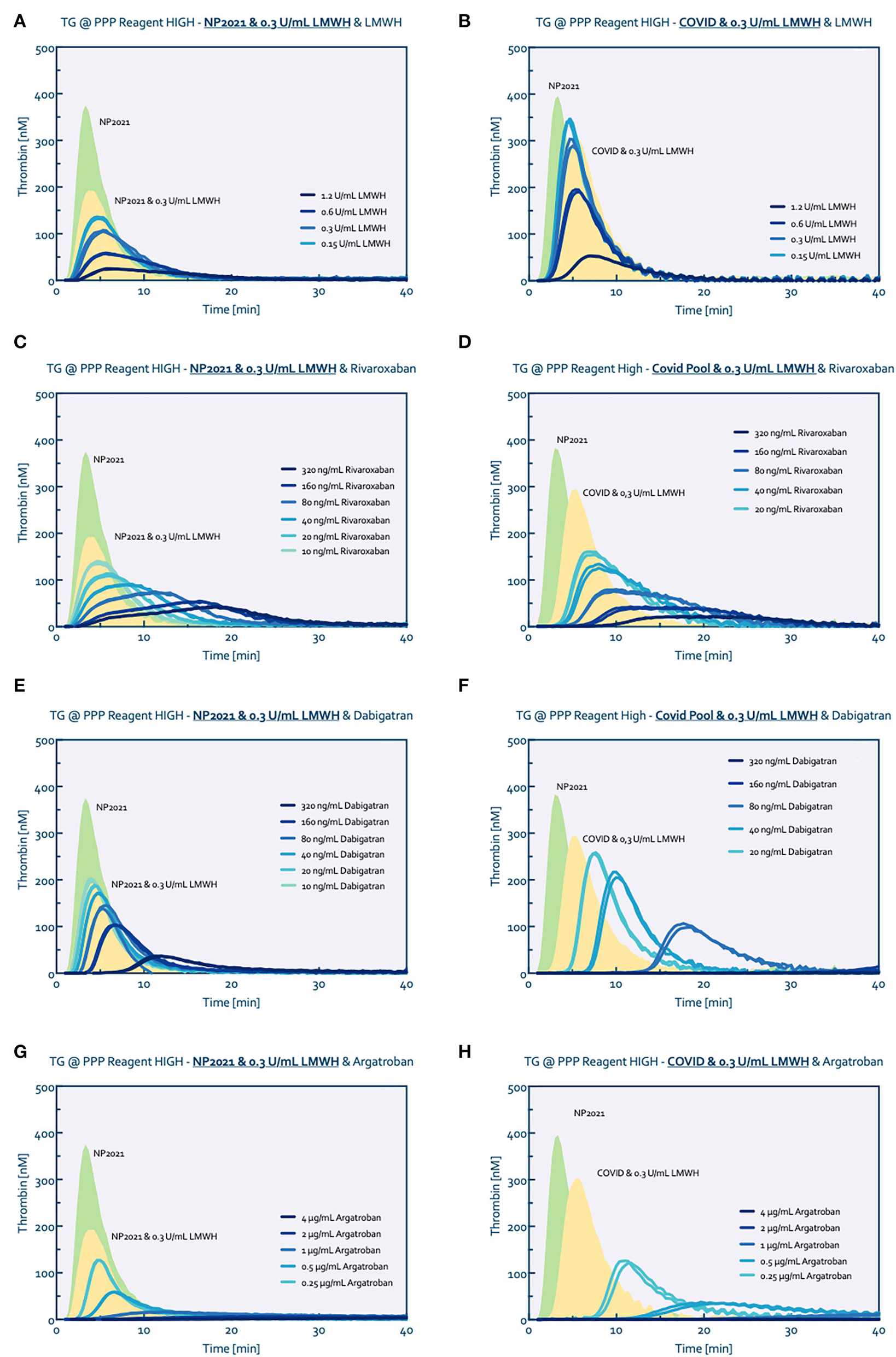 We included 33 patients with confirmed COVID-19 admitted at the ICU. TG was measured at least twice over the course of 6 weeks after admission. Thrombin generation parameters peak height and endogenous thrombin potential (ETP) were compared to healthy controls. Results were subsequently correlated with a patient characteristics and laboratory measurements. In vitro spiking in TG with rivaroxaban, dabigatran, argatroban and orgaran was performed and compared to LMWH.