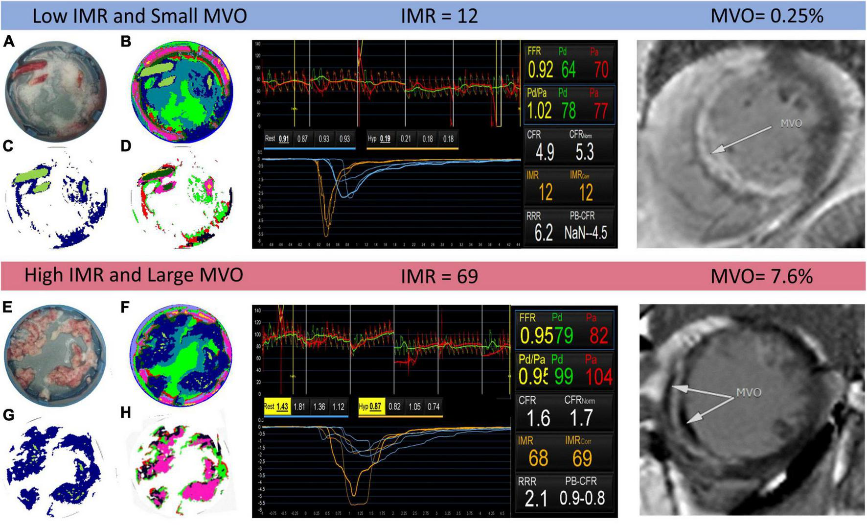 Example output of the k-means clustering analysis for two patients identified as having low and high index of coronary microvascular resistance (IMR) (centre panel) and small and large microvascular obstruction (MVO) (right panel), respectively. In the left panel, images (A,E) are photographs of the thrombus samples for each patient; images (B,F) show the results of the K = 11 k-means clustering analysis, with each colour corresponding to a different cluster; images (C,G) are the same as images (B,F) but with all non-thrombus pixels set to zero; and images (D,H) show the results of a second k-means clustering analysis with K = 7, performed only on thrombus pixels.