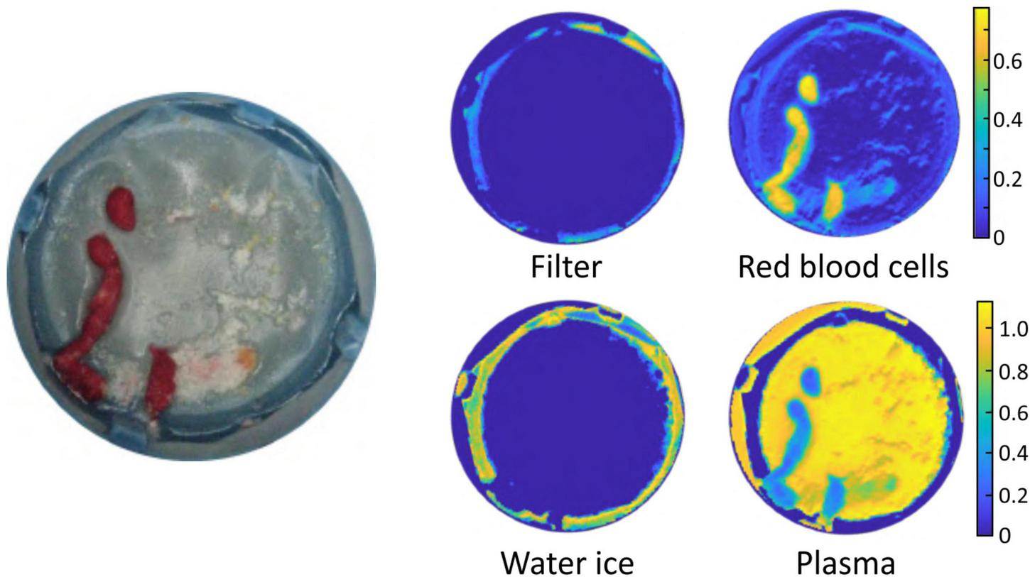 Example output of the basis function fitting process. The image on the left is a photograph of the sample. The false colour images show the fitted contributions to the spectral image from the filter, water ice, plasma, and red blood cells.