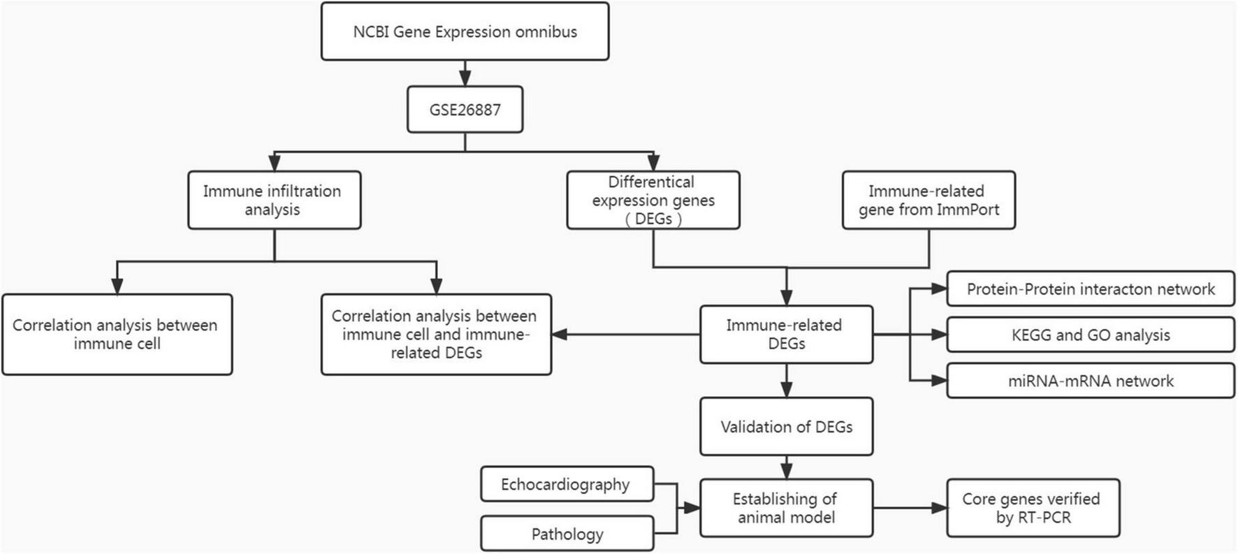 The heart tissues of the mice were fixed in paraformaldehyde and used for paraffin sections. The hearts were stained with hematoxylin and eosin (H&E) and Masson’s trichrome stain. Other mouse heart tissues were collected to prepare the homogenate. Total RNA was extracted from homogenates using a commercial kit (ES Science, China) and miScript II RT Kit (QIAGEN, Germany). All RNA reverse-transcribed into cDNA. Reverse transcription-polymerase chain reaction (RT-PCR) was performed using a PCR instrument (Roche, Switzerland). β-Actin and U6 were used as internal parameters. The relative mRNA and miRNA expression were computed using the 2–ΔΔCt method. Primer sequences for each mRNA and miRNA are displayed in Supplementary Table 1. A flow chart of this study is shown in Figure 1.