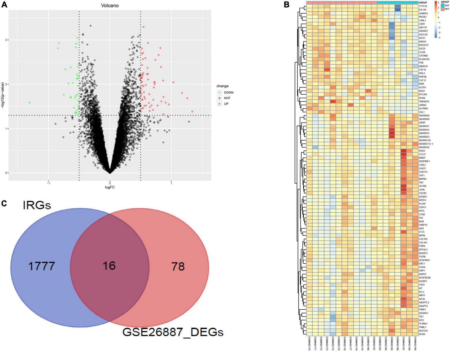 Identification of differential genes related to immunity. (A) DEGs between DHF patients and NHF patients (Red, up-regulated in DHF; green, down-regulated in NHF). (B) Heatmap of 94 DEGs. (C) Intersection of DEGs and immune related genes.