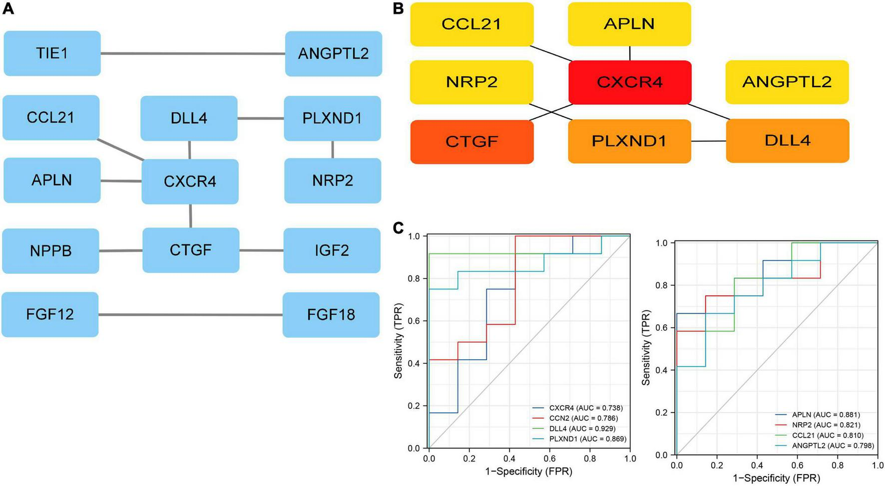 The DE-IRGs were imported into the STRING database (see the text footnote 3). The core genes were identified using the Cytohubba plugin. Finally, eight core genes with the highest scores were selected using the MCC algorithm: C-X-C motif chemokine receptor 4 (CXCR4), cellular communication network factor 2 (CCN2), delta-like canonical Notch ligand (DLL4), plexin D1(PLXND1), apelin (APLN), neuropilin 2 (NRP2), C-C motif chemokine ligand 21 (CCL21), and angiopoietin-like 2 (ANGPTL2) (Figures 4A,B).