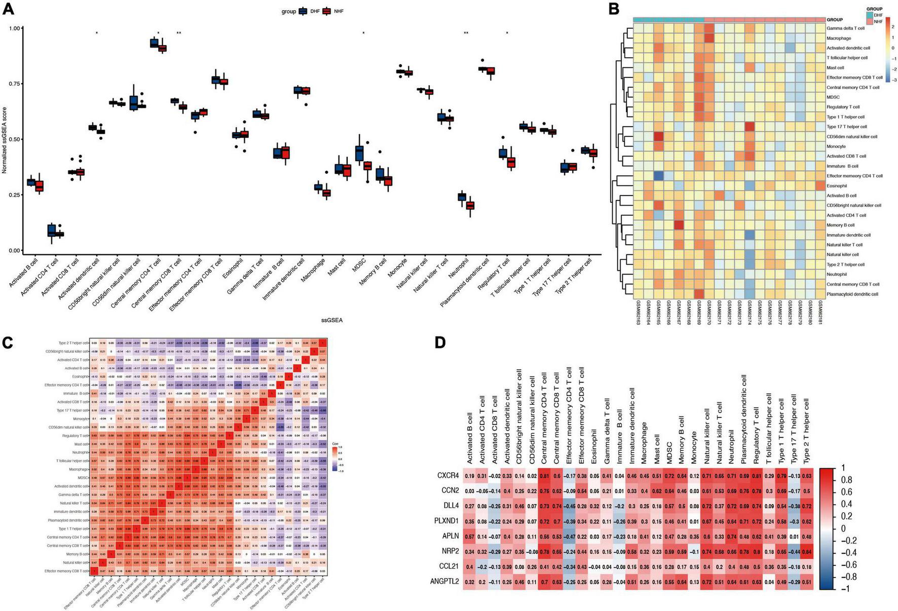 Immune infiltration of heart samples from patients with DHF or NHF was evaluated using the ssGSEA algorithm, and the immune scores were normalized to show the results more intuitively. As shown in Figure 5A, the scores of activated dendritic cells, central memory CD4 T cells, central memory CD8 T cells, myeloid-derived suppressor cells (MDSCs), neutrophils, and regulatory T cells were higher in the DHF heart sample than in the NHF sample. In addition, as illustrated in the heatmap (Figure 5B), there were significant differences in immune-infiltrating cells between the DHF and NHF heart samples. Additionally, an immune cell correlation network was constructed (Figure 5C). There was a high positive correlation between the immune cells with the above significant difference scores, and type 2 helper cells correlated negatively with type 17 helper cells (–0.66).