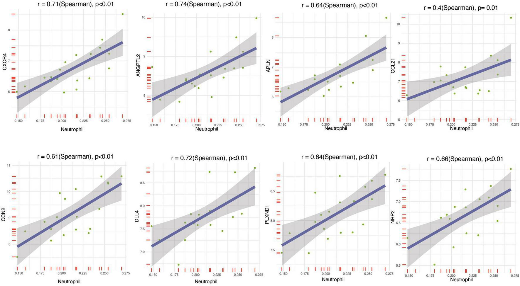 To understand the relationship between the core genes and immune cells, a correlation analysis was conducted. The results indicated that neutrophils were positively correlated with core gene expression (Figure 5D). Therefore, the correlations between neutrophils and core genes were individually analyzed and the result confirmed the positive correlation (Figure 6). The correlation between core genes and neutrophils was greater than 0.4. In particular, the correlation coefficients of CXCR4, ANGPTL2, and DLL4 were greater than 0.7, and the P-values were less than 0.01.