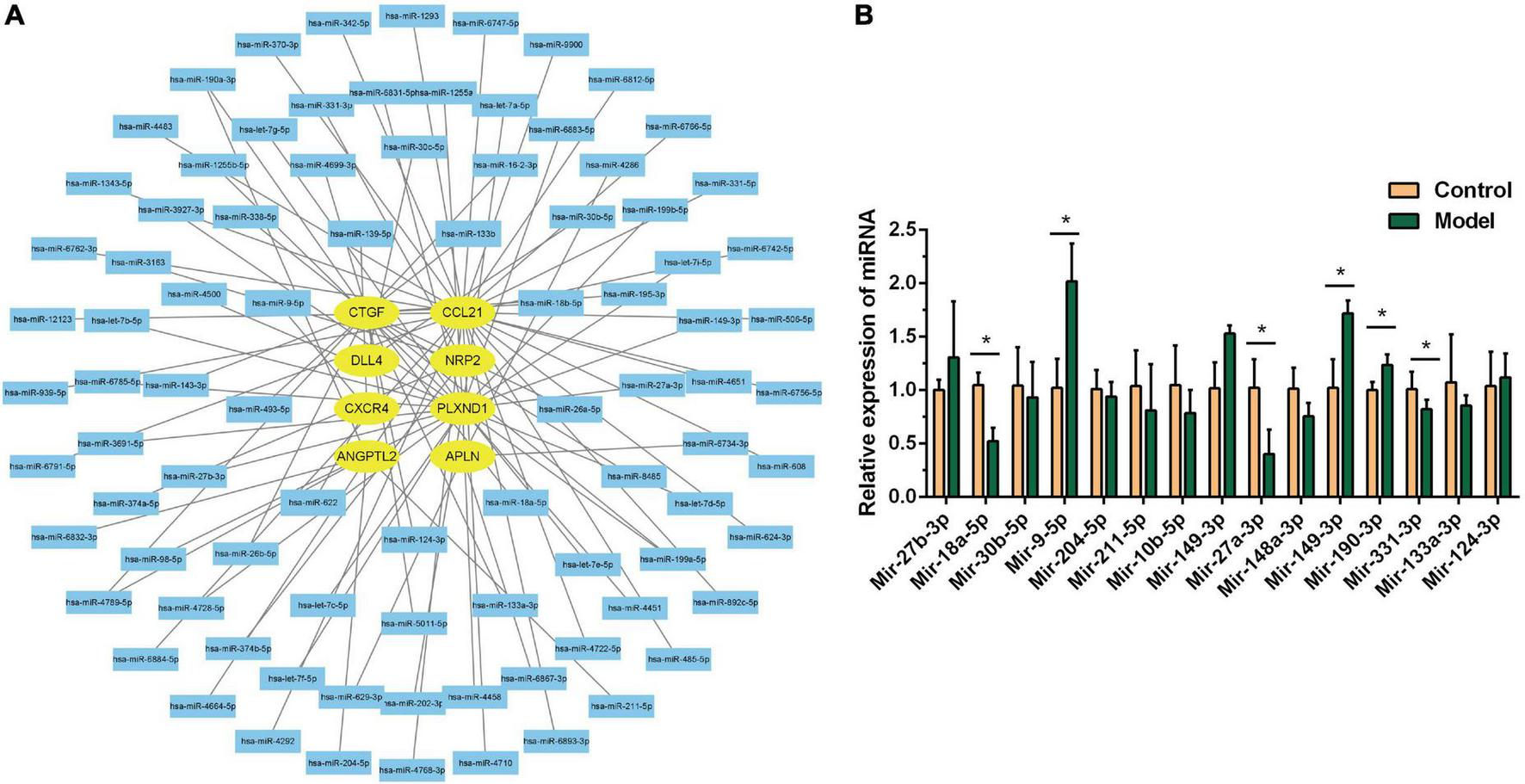MiRNA-mRNA network construction. (A) Interaction network between immune related genes and miRNA. (B) Relative miRNA expression in control group and model group. *P < 0.05.
