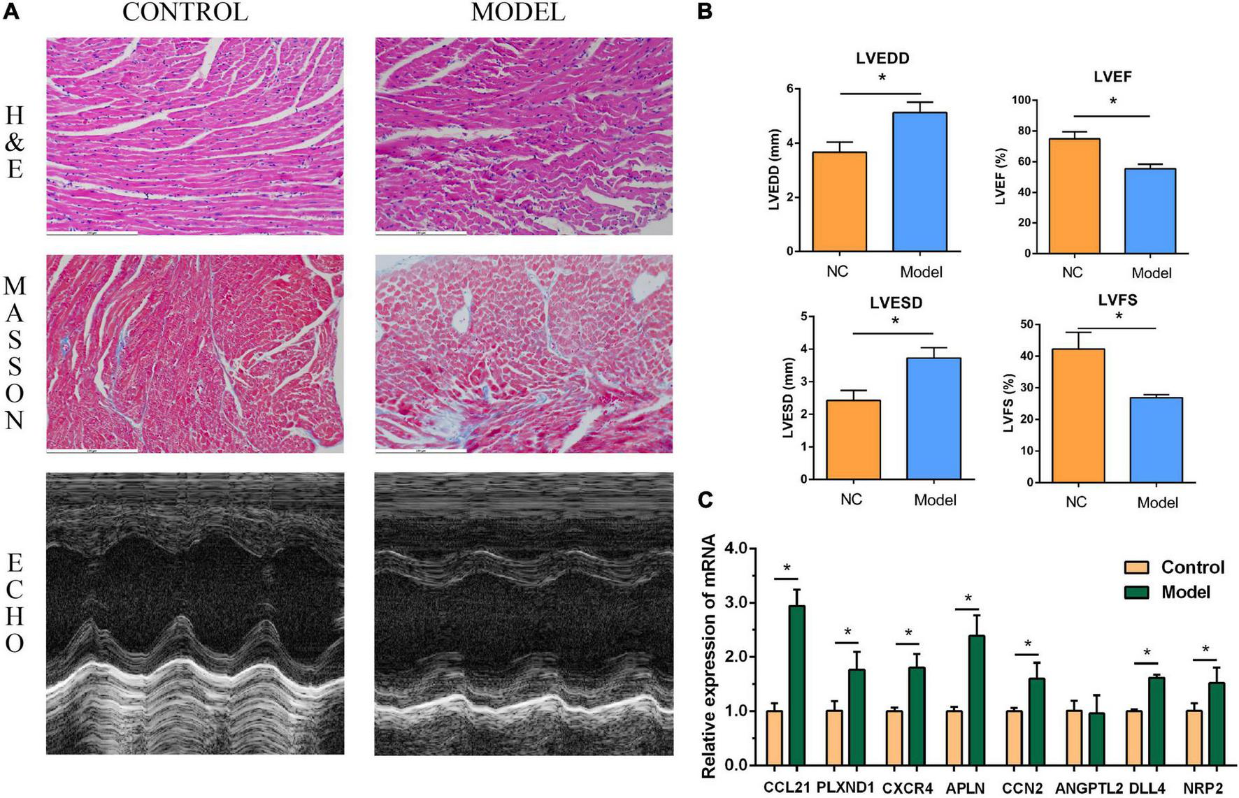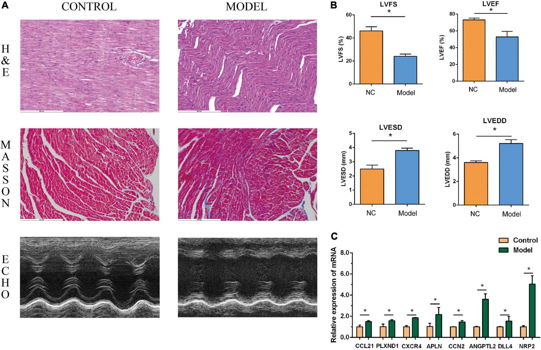 Myocardial injury and impaired heart function were assessed in Type 2 diabetic heart failure mice model. (A) Representative pictures of HE staining, Masson staining, and echocardiography (magnification, 400 ×). (B) Comparison of LVEDS, LVEDD, LVEF, and LVFS between the control group and the model group. (C) Relative mRNA expression of each core gene in control group and model group. *P < 0.05.