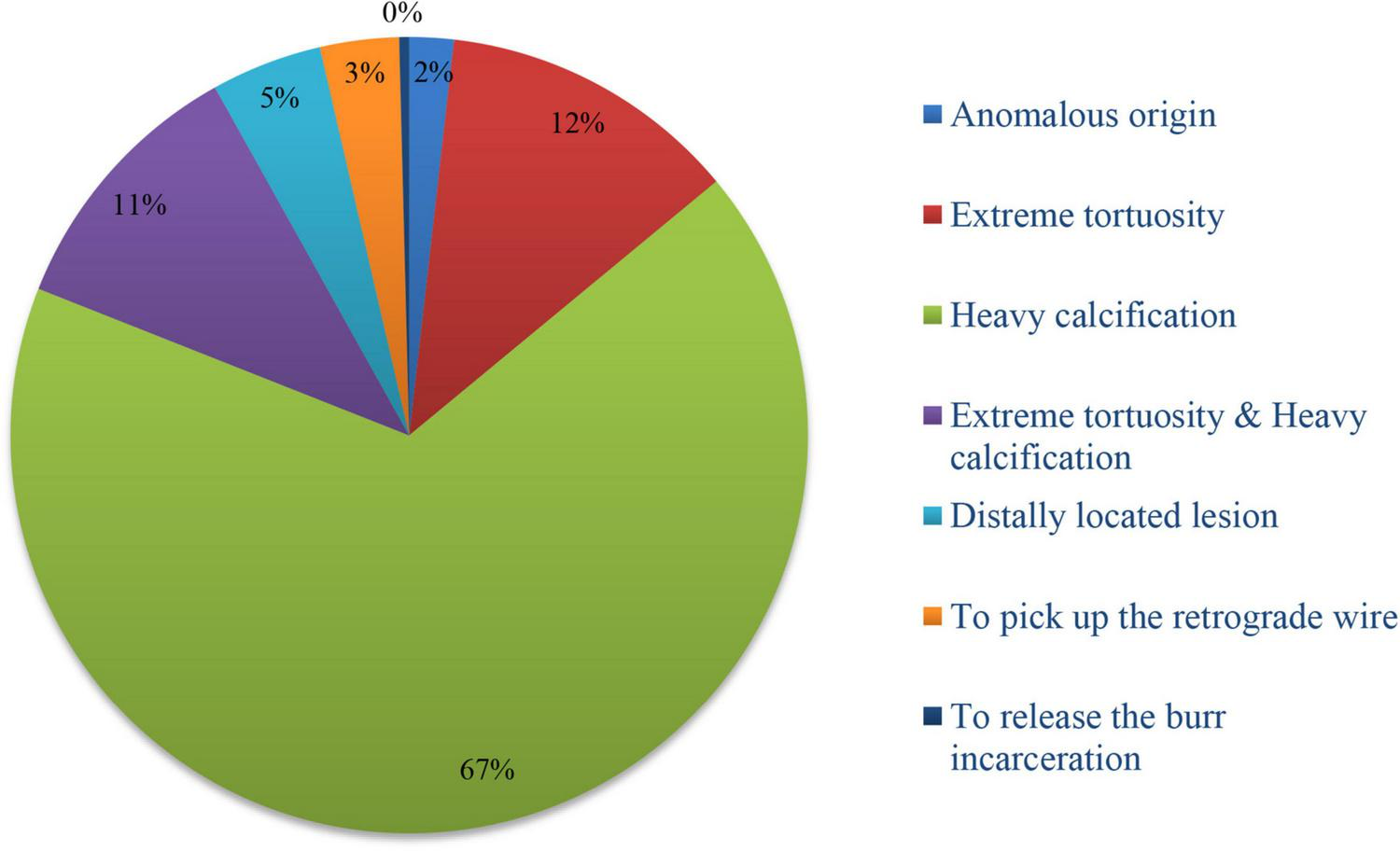 There were 237 target lesions treated, with the majority being type C lesions (95.8%), followed by B2 lesions (4.2%). Among the included cases, there were 104 cases of right coronary artery (RCA; 43.9%), 76 of left ascending artery (LAD; 32.0%), 40 of left circumflex artery (LCX; 16.9%), and 17 of LMCAD (7.2%). The most common indication for GGEC I use was heavy calcification (67%), followed by extreme tortuosity (12.2%), extreme tortuosity and heavy calcification (10.9%), distally located lesion (4.5%), picking up the retrograde wire when using the active greeting technique (AGT; 3.2%), anomalous origin of the vessel (1.8%), and releasing the burr incarceration (0.4%) (Figure 2). The typical examples of using the GGEC I during TRI in different situations are illustrated in Figure 3.