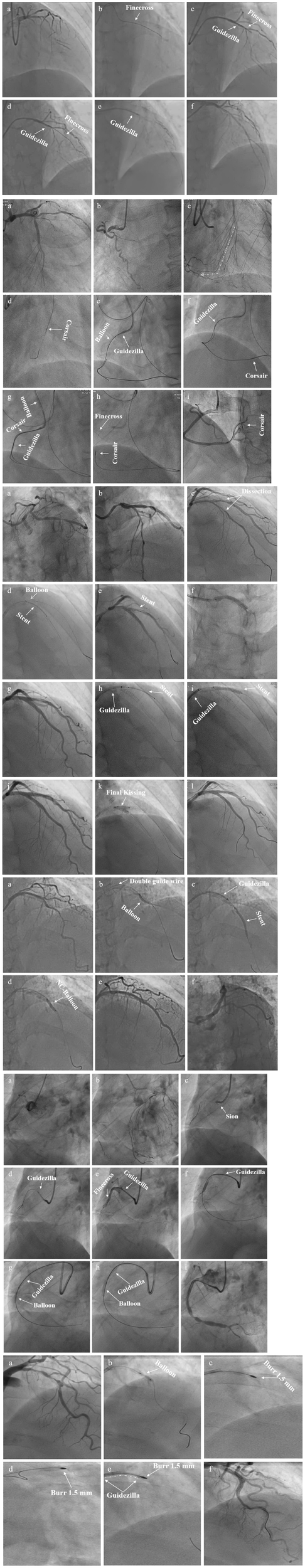 Typical examples of TRI using the GGEC I in different situation (Case 1–6). Case 1: an example of percutaneous coronary intervention (PCI) using the Guidezilla™ guide extension catheter I (GGEC I) in left ascending artery chronic total occlusion (LAD CTO) using the antegrade wire approach. A 6F BL3.5 guiding catheter angiography showed the LAD 7-segment CTO (a). Miracle 6.0 was first selected under the support of a Finecross microcatheter, but failed due to insufficient support of the guiding catheter (b). GGEC I was sent along Miracle 6.0 to the LAD 6-segment and then the microcatheter was used to control Miracle 6.0 to smoothly penetrate the proximal fibrous cap of the occlusive disease (c). Miracle 6.0 was then carefully manipulated into the true lumen of the occluded distal blood vessel to the end of the LAD (d). Then, Miracle 6.0 was replaced with Sion via the Finecross microcatheter (e). Finally, the stent was successfully implanted after pre-expansion with balloons of different specifications (f). Case 2: An example of PCI using the GGEC I in right coronary artery (RCA) CTO with retrograde wire approach. TIG angiography showing the LAD 7-segment CTO (a) and RCA 1-segment CTO (b). First, the antegrade wire approach was used to open the LAD, and then the retrograde wire approach was used to open the RCA CTO (c, the white dotted line shows the retrograde pathway used in the operation). Under the support of the Corsair microcatheter, Sion was carefully manipulated through the S1 collateral branch (d) to advance the Corsair microcatheter to the RCA 3-segment along the guidewire, and changed to the UB 3 via the microcatheter; then, UB 3 was directed to the RCA 2-segment through the occluded vessel distal segment. Next, Miracle 6.0 was forwardly manipulated to penetrate the proximal fibrous cap of the occlusive lesion to the RCA 3-segment and the GGEC I was sent along Miracle 6.0 to the RCA1 segment. Then, the Reverse-Controlled Antegrade And Retrograde Subintimal Tracking (R-CART) technique was initiated (e), using Active Greeting Technique (AGT) to reversely manipulate Fielder XT into GGEC I (f). Fielder XT was pushed further forward into 6F SAL 1.0, then anchored with a balloon to push Corsair into 6F SAL 1.0 forcefully (g). The Rendezvous technique failed, and Sion was reverse manipulated into the forward Finecross microcatheter through the Corsair microcatheter, and the Finecross microcatheter was pushed forward to the posterior branches of left ventricular (PL) along Sion while withdrawing the Corsair microcatheter backward (h). Stents were implanted after dilating the occluded blood vessel with predilated balloons of different sizes along the guidewire after the Finecross microcatheter was removed (i). Case 3: An example of PCI using GGEC I in both LM and LAD bifurcation lesions. 6F JL3.5 angiography showed approximately 80% stenosis of the LM end, 50-80% stenosis of the LAD 6-7 segment, and subtotal occlusion in the proximal segment of D1 (a,b). The two Runthroughs were carefully manipulated to enter the ends of the LAD and D1, respectively, and narrow lesions were expanded with a balloon, resulting in residual stenosis of approximately 50% in the LM end, and severe dissection of LAD7 and proximal D1 with thrombolysis in myocardial infarction (TIMI) flow grade 3 as seen by angiography (c). The Crossover strategy was used to treat LM bifurcation lesions, and the inverse mini-crush technology was used to treat LAD and D1 bifurcation lesions (d). However, after repeated attempts, it was difficult for the stent to enter D1 and completely cover the lesion (e), so a stent was immediately implanted in LM-LAD (f). Angiography showed that the stent was fully expanded, with a blood flow of TIMI level 3 (g). Next, a GGEC I was sent along the guidewire to the opening of D1, and a stent successfully sent to D1 via the GGEC I and completely covered the lesion (h). After withdrawing the GGEC I to the LAD opening, the stent was successfully released in the D1 (i). Angiography showed that the stent was fully expanded and the blood flow was TIMI level 3 (j). Finally, by rewiring the Runthrough into the LAD and completing the Final Kissing step (k), the operation was a success (l). Case 4: An example of PCI using the GGEC I in LAD with extreme tortuosity and severely calcified lesions. 6F EBU 3.75 angiography showed extreme tortuosity and heavy calcification in LAD 6–8 segments with approximately 80% stenosis (a). Two Runthroughs were manipulated to reach the end of the LAD through the stenosis, and Sprinter 2.0 × 15 mm and NC Sprinter 2.5 × 15 mm were pushed into place in turn with difficulty, under the support of a double guidewire, which was used to expand the stenosis under high pressure (20–24 atm) (b). Then, three stents were implanted via the GGEC I from distal to proximal LAD 6–8 (c). Finally, NC-balloons of different figures were selected to expand the stents under high pressure (20–24 atm) (d), and angiography showed that the stents were fully expanded with a blood flow of TIMI 3 (e,f). Case 5: An example of PCI using the GGEC I in CTO of the RCA with abnormal opening. Angiography showed that the ascending aorta was significantly widened, the end of RCA 2 segment showed localized occlusion, and the bridging collaterals supplied blood to make the distal vessels partially visible (a). The LAD provided the collaterals, and the RCA was retrogradely perfused to the end of segment 3 (b). It was difficult to keep the 6F AL 1.0 guiding catheter in place, and Sion was patiently manipulated to “float” into the RCA (c). Then, the GGEC I was slowly pushed along Sion into the RCA (d). Sion was exchanged with Conquest pro 8–20 via the Finecross and manipulated carefully through the occluded segment (e) and into PL (f) under multi-position fluoroscopy. Under the support of the GGEC I, pre-expansion was performed using balloons of different specifications (g,h). Finally, the stent was