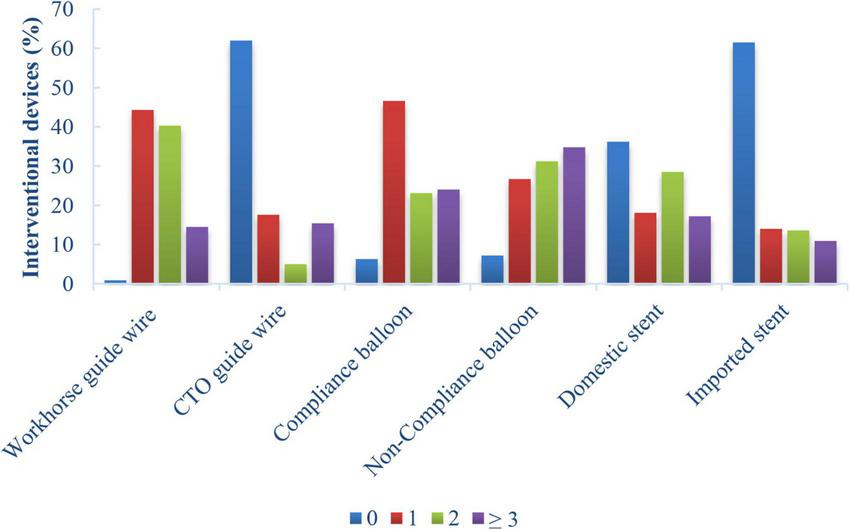 In most cases, the GGEC I was inserted more than 20 mm deep into the vessels using the balloon-assisted sliding and tracking (BLAST) technique. In 18 cases (7.6%), TRI was successfully completed with the help of GGEC I after rotational atherectomy. The mean operative time was 58 minutes, and the overall success rate was 94.1%, with four patients receiving DCB treatment without stents. For each vessel, CTO had a longer operative time (RCA 93 vs. 63.5 min; LAD 76.5 vs. 53.5 min; LCX 64 vs. 57.5 min; P < 0.05) and a lower success rate (RCA 88.2% vs. 92.3%; LAD 85% vs. 96.1%; LCX 84.6% vs. 92.5%; P < 0.05) (Table 3). Furthermore, the analysis results for interventional devices showed that one to two workhorse guide wires (44.3 and 40.3%, respectively) were needed in most cases, while one or more than three CTO guide wires (17.6 and 15.4%, respectively) were needed for opening the CTO lesions (Figures 4, 5). On the other hand, one pre-dilated balloon (46.6%) and two or more than three post-dilated balloons (31.2 or 34.8%, respectively) were usually used for lesion modification and optimization, with a high proportion of domestic stent implantation (63.8%) (Figure 4). No GGEC-associated procedural complications (dissection, stent dislodgement, shaft breakage, etc.) were reported. Two patients (0.9%) with LAD PCI experienced subacute stent thrombosis on the fourth and sixth day after stenting and were successfully treated by emergency high-pressure dilation with non-compliant (NC)-balloon. No other procedure-related complications and major clinical events occurred during the hospitalization or follow-up period of at least 1 month.