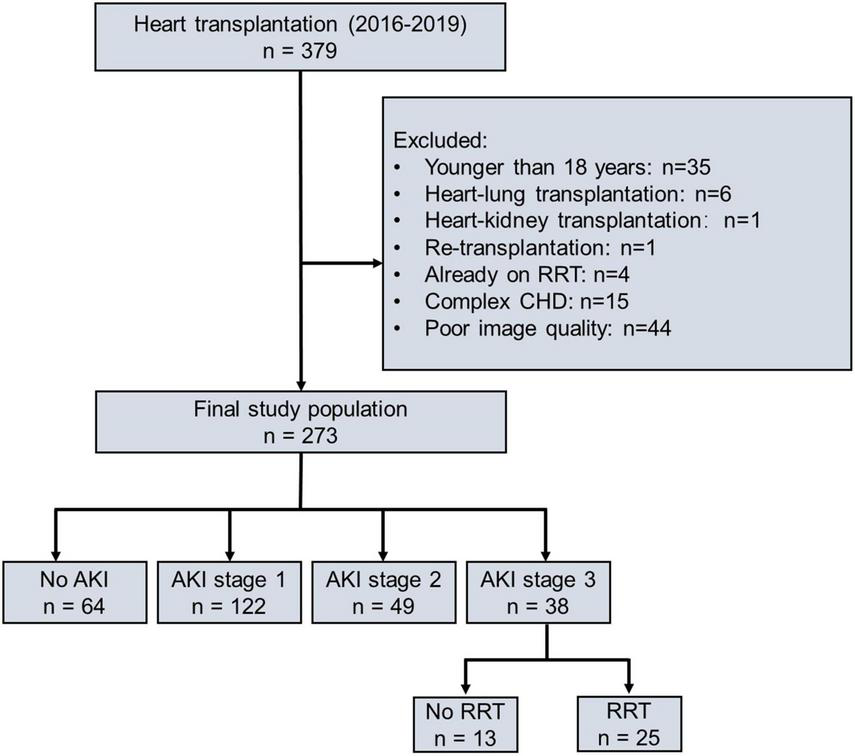 From 1 January 2016 to 31 December 2019, 379 patients underwent HTx at the Wuhan Union Hospital, of which 35 patients were under 18 years old, 6 patients underwent heart–lung transplantation, 1 patient underwent heart–kidney transplantation, 1 patient underwent retransplantation, 4 patients required RRT preliminary to transplantation, 15 patients had complex congenital heart disease, and 44 patients did not have images of sufficient quality, respectively. Finally, 273 patients were included in this study (Figure 1). Of 273 patients, 209 (77%) patients occurred AKI, including 122 (45%) patients in stage 1 AKI, 49 (18%) patients in stage 2 AKI, and 38 (14%) patients in stage 3 AKI. Of those who developed AKI stage 3, 25 (9%) patients required RRT which lasted for a median of 6 days [interquartile range (IQR) 3–14]. The incidence of AKI is given in Supplementary Figure 1. The time distribution for the occurrence of AKI with the highest peaks for all the three stages is shown in Supplementary Figure 2. Patients included in the study did not differ from those excluded with regard to recipient age, sex, body mass index (BMI), etiology of transplantation, baseline eGFR, or overall incidence of AKI (Supplementary Table 1).
