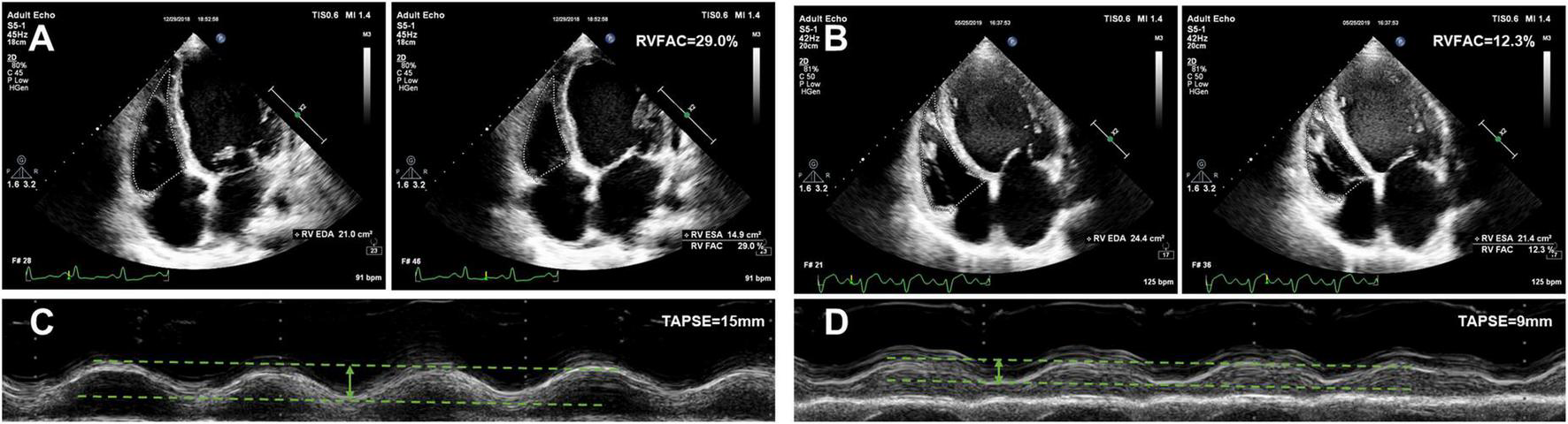 The echocardiographic characteristics according to the AKI stage are given in Table 2. The median time from echocardiographic examination to HTx was 17 days. Patients with a higher AKI stage displayed a larger RA dimension (45, 46, 46, and 55 mm, P trend < 0.001), and a worse RV function (TAPSE 17, 17, 15, and 12 mm, P trend < 0.001; RVFAC 28, 28, 26, and 22%, P trend < 0.001). Representative examples of RVFAC and TAPSE measurement from patients awaiting heart transplant without AKI and with AKI stage 3 are shown in Figure 2. However, left atrial, LV, RV, pulmonary artery (PA), and inferior vena cava (IVC) dimension, LV mass, E/e’ ratio, LV end-diastolic volume, LV end-systolic volume, LVEF, and moderate to severe tricuspid regurgitation did not differ among the AKI stages.