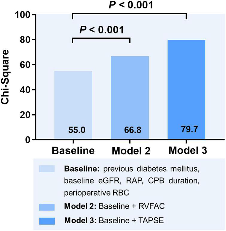A total of 273 HTx recipients were included in the study. Postoperative AKI occurred in 209 (77%) patients, including 122 (45%) patients in stage 1 AKI, 49 (18%) patients in stage 2 AKI, and 38 (14%) patients in stage 3 AKI. Patients with higher AKI stage had lower baseline estimated glomerular filtration rate (eGFR), more frequent diabetes, higher right atrial pressure (RAP), longer cardiopulmonary bypass (CPB) duration, more perioperative red blood cell (RBC) transfusions, and worse preoperative RV function. A multivariate logistic regression model incorporating previous diabetes mellitus [odds ratio (OR): 2.21; 95% CI: 1.06–4.61; P = 0.035], baseline eGFR (OR: 0.99; 95% CI: 0.97–0.10; P = 0.037), RAP (OR: 1.05; 95% CI: 1.00–1.10; P = 0.041), perioperative RBC (OR: 1.18; 95% CI: 1.08–1.28; P < 0.001), and TAPSE (OR: 0.84; 95% CI: 0.79–0.91; P < 0.001) was established to diagnose moderate to severe AKI more accurately [the area under the curve (AUC) = 79.8%; Akaike information criterion: 274].