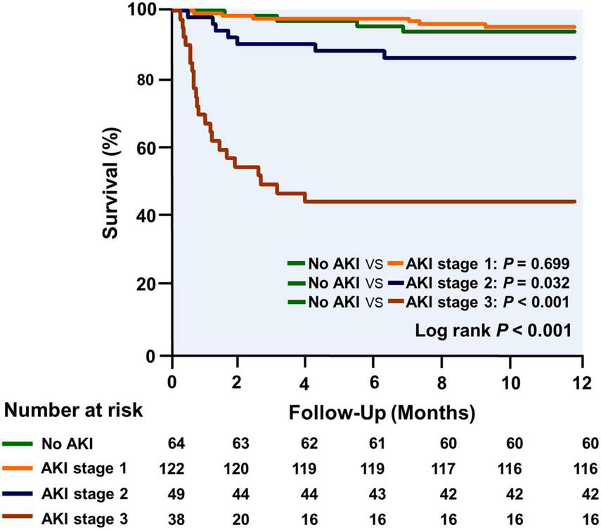 Table 1 shows the baseline characteristics and perioperative data stratified by the AKI stage. Patients who had higher AKI stage shows lower baseline eGFR (88, 80, 77, and 64 ml/min/1.73 m2, P trend < 0.001), more frequent diabetes (11, 15, 20, and 26%, P trend = 0.028), higher baseline RAP (12, 11, 13, and 17 mm Hg, P trend < 0.001), longer cardiopulmonary bypass (CPB) duration (103, 110, 118, and 131, P trend < 0.001), and more perioperative red blood cell (RBC) transfusions (6, 7, 8, and 13, P trend < 0.001). Postoperatively, they were more likely to be diagnosed with RVF (6, 5, 18, and 39%, P trend < 0.001), primary graft failure (2, 2, 4, and 16%, P trend < 0.001), and the risk of rethoracotomy was higher (0, 0.8, 6, and 26%, P trend < 0.001). Therefore, patients with a higher AKI stage required more intra-aortic balloon pump (IABP) (30, 33, 53, and 58%, P trend < 0.001), and extracorporeal membrane oxygenation (ECMO) support (2, 0, 10, and 21%, P trend < 0.001).