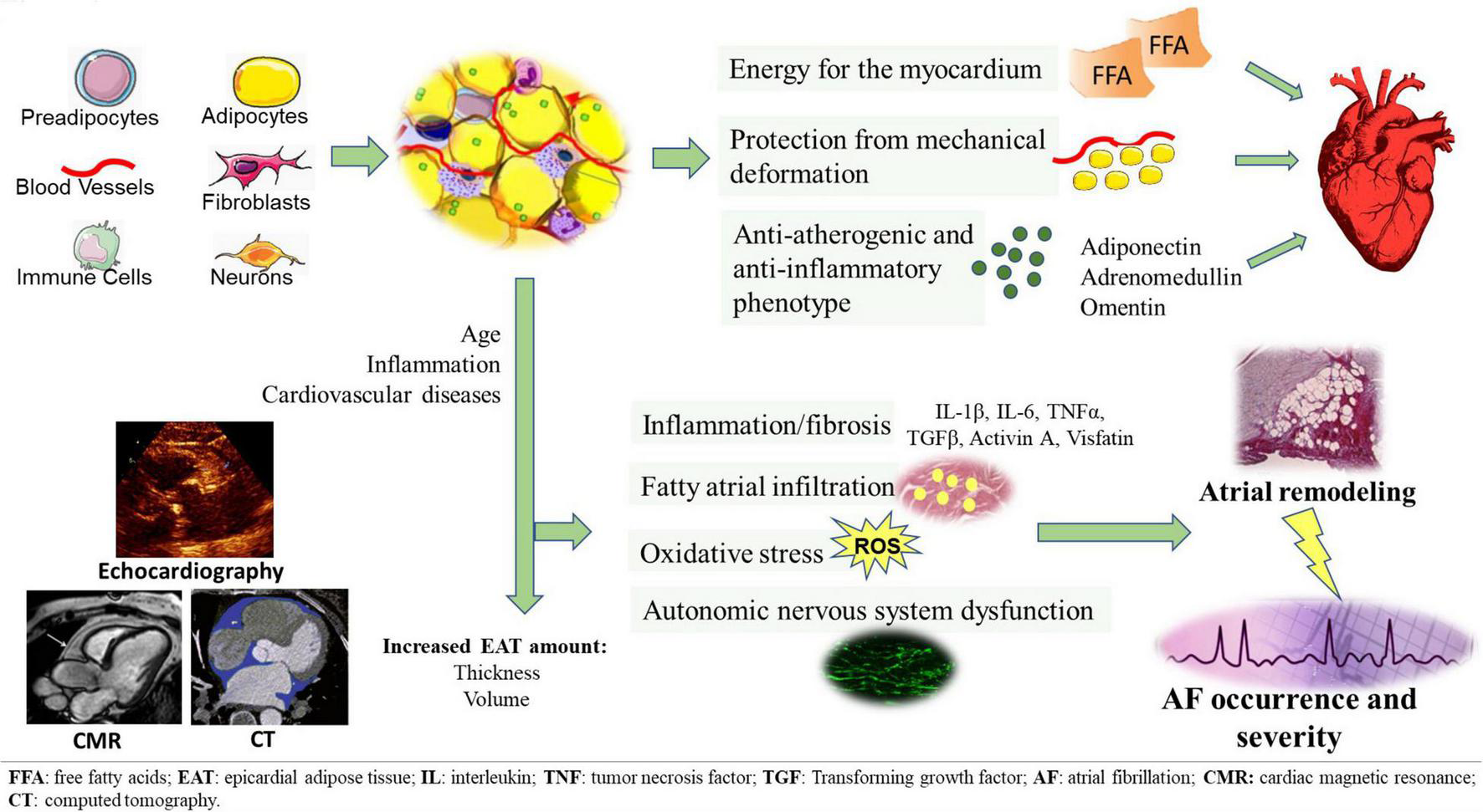 EAT tissue structure and its pathological switch from a protective anti-inflammatory and anti-atherogenic phenotype to a pro-inflammatory, pro-fibrotic, and pro-adrenergic one. EAT potentially contributes to the development of AF through several arrhythmogenic mechanisms, including fatty atrial infiltration, secretion of pro-inflammatory and pro-fibrotic mediators, oxidative stress, autonomic nervous system dysfunction. EAT measurement can be obtained through different imaging methods, such as echocardiography, CT and CMR.