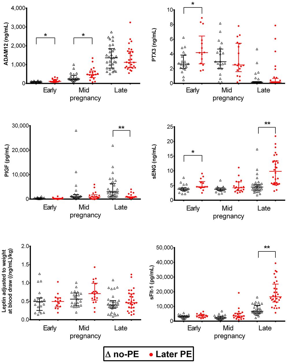 Dynamics of preeclampsia-related biomarkers throughout gestation in healthy and preeclamptic pregnancies. Luminex® 6PLEX assay measurement data of concentrations of ADAM12, PTX3, PlGF, sENG, and sFlt-1 in 132 serum samples collected from pregnant women. The early pregnancy group was comprised of 14 samples drawn at 70–98 g days from women that later developed PE and 20 samples from controls collected at 76–96 g days. The mid-pregnancy sample set comprised 18 PE and 21 control pregnancy sera, sampled at 100–180 and 109–182 g days, respectively. Data of late pregnancy samples representing 28 PE (206–275 g days) and 31 control sera (210–274 g days) were obtained from our recent study (15). All women, irrespective of the pregnancy outcome (PE or no-PE), were normotensive at blood draw. The whiskers on the plot show the median with an interquartile range. The statistical difference in biomarker distributions between PE and control cases was compared using the Mann-Whitney U-test, * representing P < 0.05 and **P < 0.0001. ADAM12, ADAM Metallopeptidase Domain 12; g days, gestational days; PlGF, placental growth factor; PTX3, Pentraxin3; sENG, endoglin; sFlt-1, soluble fms-like tyrosine kinase 1.