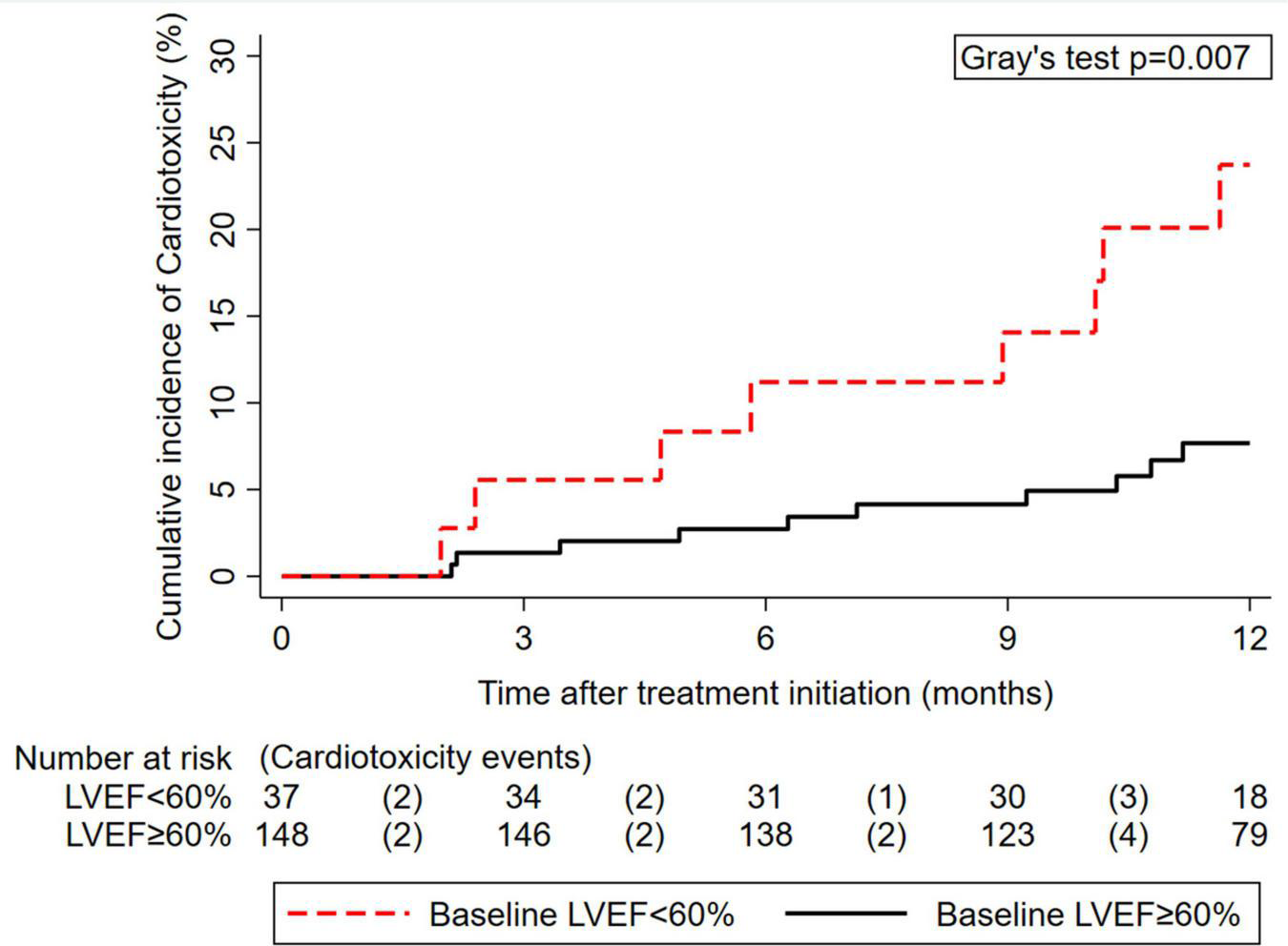 Figure 1. Cumulative 12-month incidence of cardiotoxicity according to pre-treatment left ventricular ejection fraction (LVEF) (n = 185). The numbers below the x-axis represent a risk table, with the number of patients at risk for cardiotoxicity at the beginning of each interval and the number of patients who developed cardiotoxicity during the pertinent interval in round brackets.