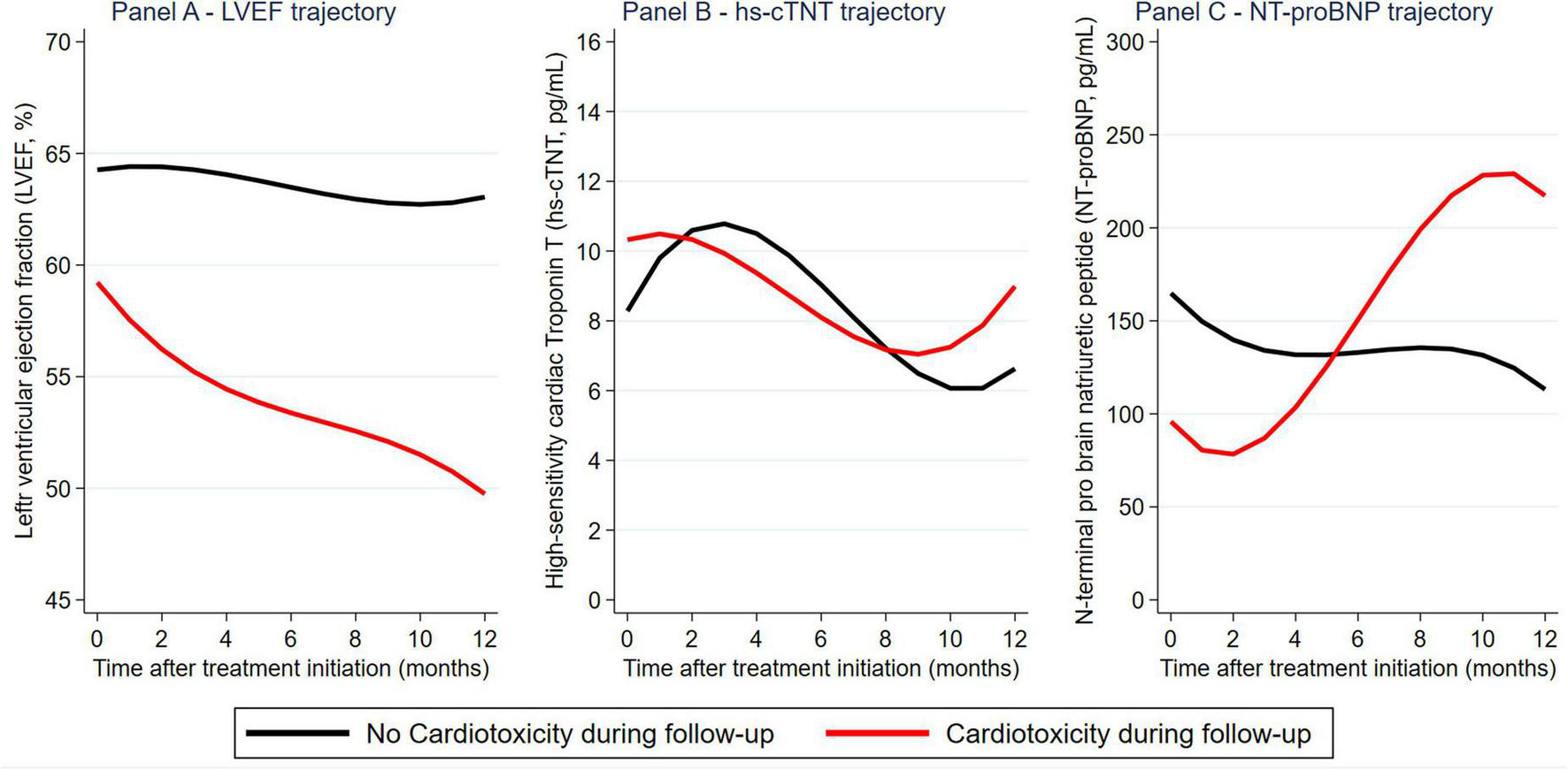 Cardiotoxicity risk and longitudinal trajectories of left ventricular ejection fraction, hs-cTnT, and NT-proBNP