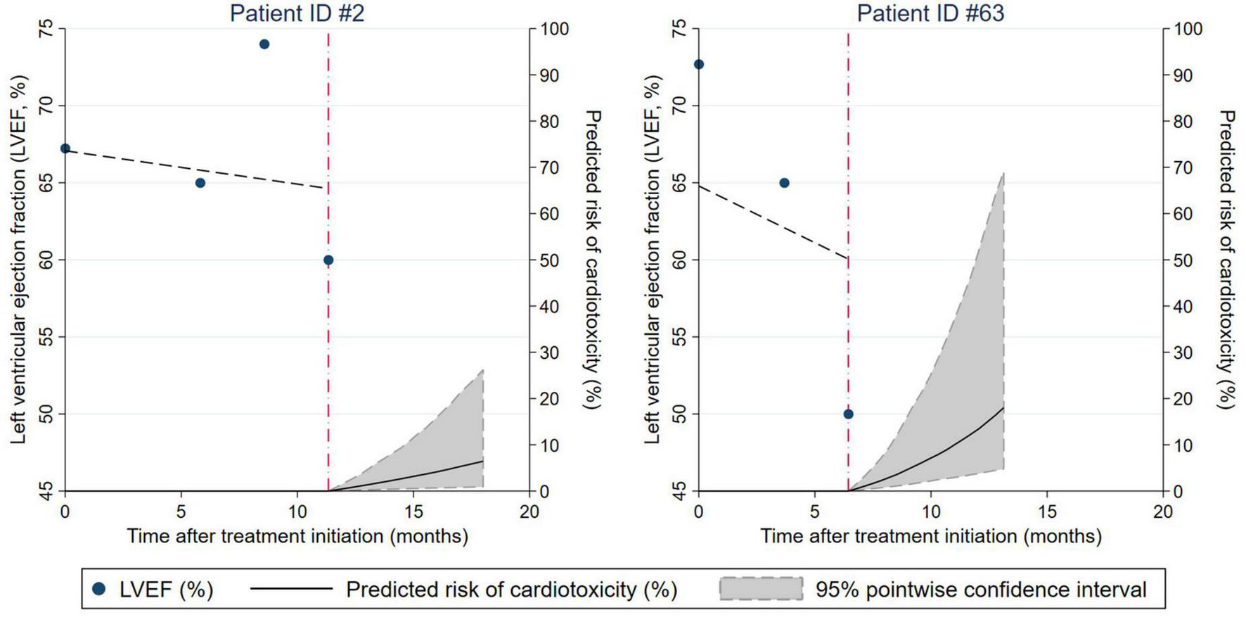 Figure 3. Dynamic prediction of cardiotoxicity risk for individual patients conditional on their prior left ventricular ejection fraction (LVEF) trajectory. Results are from a joint model of longitudinal and time-to-event data. The characteristics of patients ID#2 and ID#63 are described in the Results section, paragraph “Personalized prediction of cardiotoxicity risk based on LVEF trajectories.”