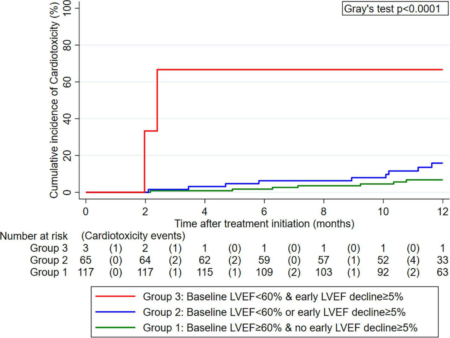 Figure 4. Cumulative 12-month incidence of cardiotoxicity according to three groups defined by pre-treatment left ventricular ejection fraction (LVEF) and early LVEF change after treatment initiation (n = 185). Data were estimated with competing risk cumulative incidence estimators, treating death-from-any-cause as the competing event of interest. The numbers below the x-axis represent a risk table with the number of patients at risk for cardiotoxicity at the beginning of each interval and the number of patients who developed cardiotoxicity during the pertinent interval in round brackets.