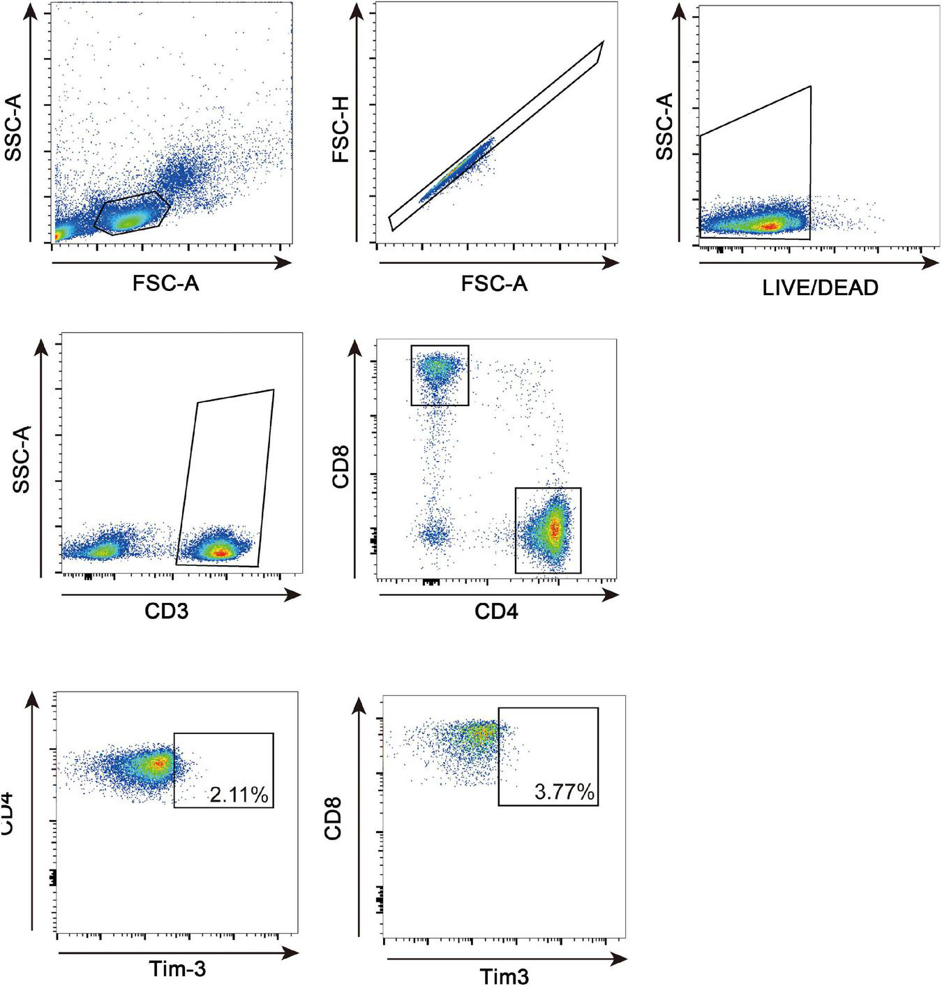 FACS gating strategy for lymphocytes. Representative flow cytometric dot plots to determine CD4+ and CD8+ lymphocytes in human PBMCs. PBMC were gated as lymphocytes on forward and side scatter density plots. Then, singlets were gated on FSC-A and FSC-H plots, and live cells were gated for subsequent analysis. CD4+ and CD8+ T cells were identified from the positive population for CD3. CD4+ Tim-3+ and CD8+Tim-3+ subpopulation were gated on CD4+ and CD8+ T cells, respectively.