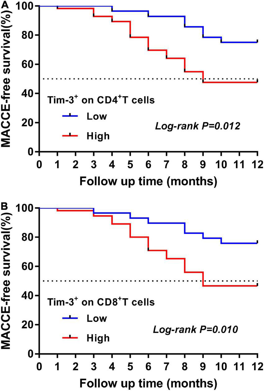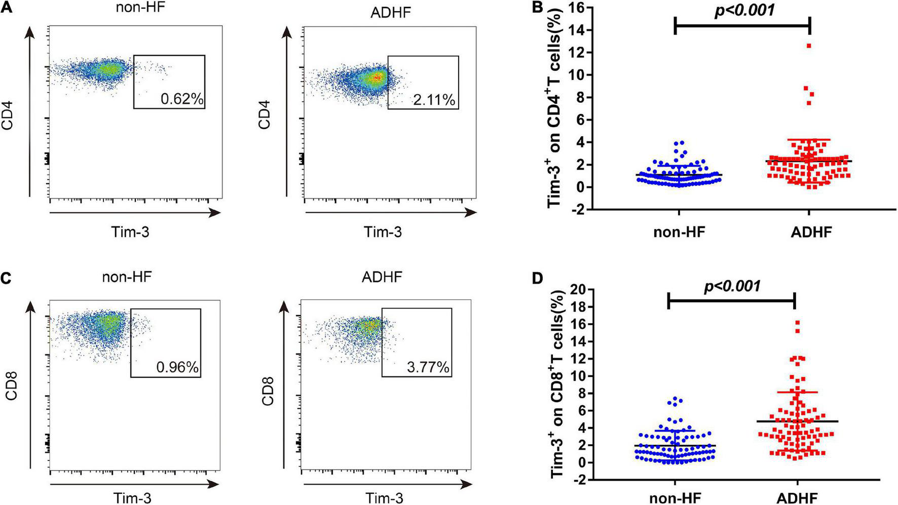 We found that the Tim-3 expression on CD4+ T cells [2.08% (1.15–2.67%) vs. 0.88% (0.56–1.39%), p < 0.001] and CD8+ T cells [3.81% (2.24–6.03%) vs. 1.36% (0.76–3.00%), p < 0.001] in ADHF group were significantly increased vs. the non-ADHF group. Logistic analysis revealed that high levels of Tim-3 expressed on CD4+ and CD8+ T cells were independent risk factors of ADHF (OR: 2.76; 95% CI: 1.34–5.65, p = 0.006; OR: 2.58; 95% CI: 1.26–5.31, p = 0.010, respectively). ROC curve analysis showed that the high level of Tim-3 on CD4+ or CD8+ T cells as a biomarker has predictive performance for ADHF (AUC: 0.75; 95% CI: 0.68–0.83; AUC: 0.78, 95% CI: 0.71–0.85, respectively). During a median follow-up of 12 months, the Cox regression analysis revealed that higher Tim-3 on CD4+ and CD8+ T cells were strongly associated with increased risks of MACCE within 12 months after ADHF (HR: 2.613; 95% CI: 1.11–6.13, p = 0.027; HR: 2.762, 95% CI: 1.15–6.63, p = 0.023; respectively).