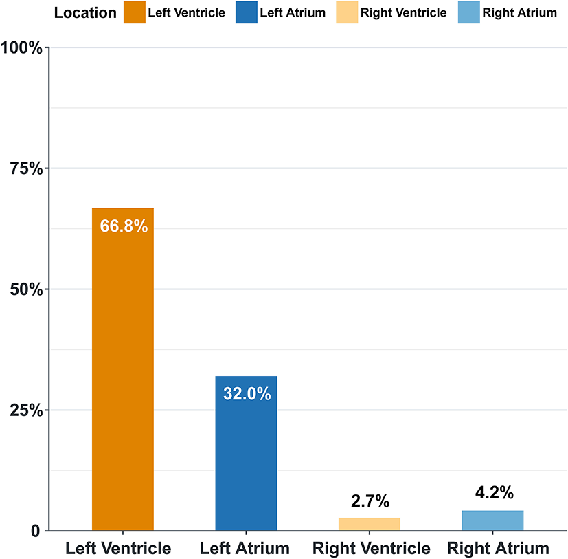 Overall, the prevalence of left-sided intracardiac thrombi is more than right-sided ones, and the ventricular ones constitute the majority. The left ventricle is the most frequently involved among the four chambers (66.8%), followed by the left atrium (32%) (Figure 1).