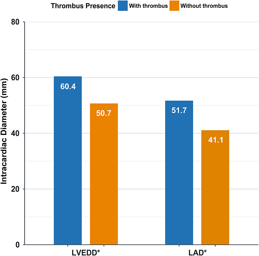 Intracardiac diameter in patients with and without thrombus. LVEDD, left ventricular end-diastolic diameter; LAD, left atrial diameter; * P < 0.0001.