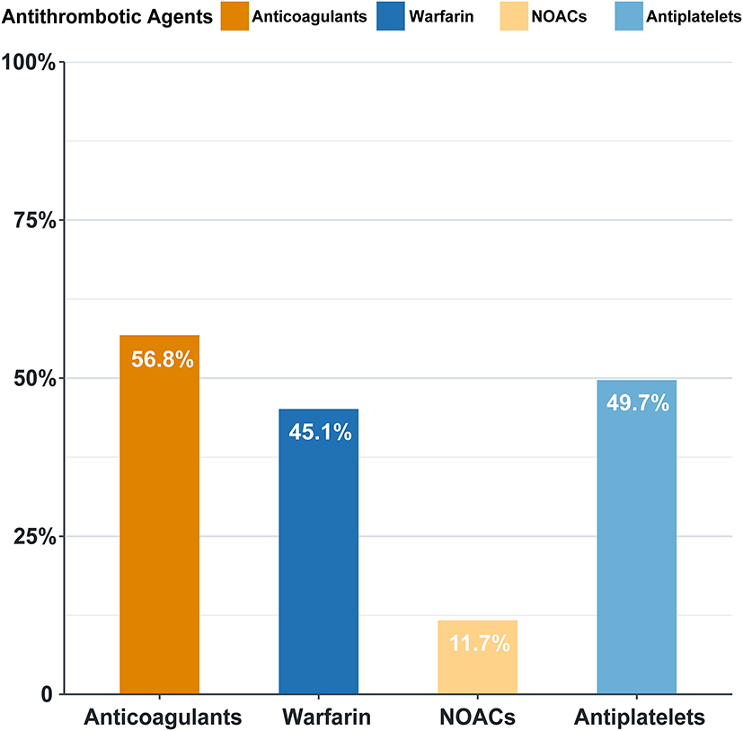 In our study, the overall anticoagulation rate was 56.8%, among which warfarin was the main treatment (45.1%). Antiplatelets were prescribed in 49.7% of the patients (Figure 4). The administration of non-vitamin K antagonist oral anticoagulants (NOACs) and warfarin differs with time (Figure 5). Before 2012, the anticoagulant rate in patients with HF and intracardiac thrombus was < 50%, with warfarin being the only option. However, since 2012, the rate increased year by year with an increasing proportion of NOAC prescriptions and a gradual decline in the warfarin prescription. In 2018, the use of NOACs exceeded that of warfarin.