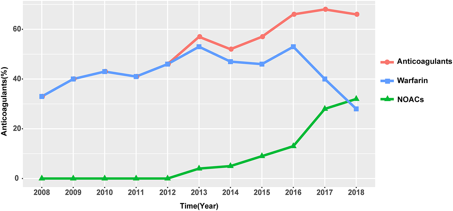 The overall anticoagulation prescription rate was 56.8% in our study, 45.1% were on warfarin therapy, and nearly half of the patients were off anticoagulation. Despite a relatively low prescription rate, an increasing trend in the anticoagulation rate is encouraging (Figure 5). Warfarin keeps its leading status as the most widely accepted anticoagulant owing to its relatively low price, definitive curative effect, and established adverse drug reaction. But warfarin therapy has non-negligible limitations, such as the interaction between foods and drugs, narrow therapeutic window, and demand for close monitoring. For HF patients with significantly decreased exercise tolerance, warfarin is at a competitive disadvantage as to patient compliance. Novel options are welcome to redress the balance, and a shift in inclination is partly reflected in the anticoagulant trend over time. Since 2012, the use of NOACs started to rise to become an increasingly popular option for clinicians, reflecting a gradually established and re-enforced awareness of these novel agents. Though pieces of evidence are accumulating regarding NOACs and nonvalvular AF anticoagulation, which indicate inferiority in stroke prevention (18, 19), there is still an evidence gap profiling safety and effectiveness of its role in intracardiac thrombus prevention and treatment in HF patients. Evidence regarding the effectiveness of NOAC application in this field is mostly based on case reports or small-scale studies, with anticoagulation duration varying from 30 days to 3 months (20–22). Hence, well-designed further studies are needed to explore the risk-benefit profile of NOACs in HF patients with intracardiac thrombus.
