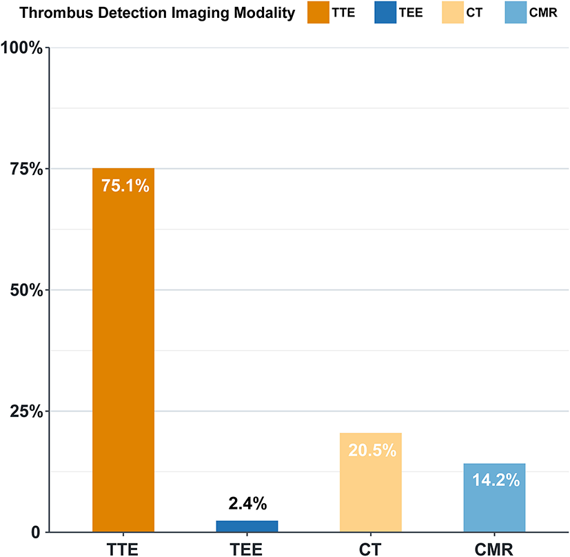 The present study shows that TTE is the most important method in thrombus detection in HF patients, which is also the most commonly used method for the evaluation of cardiac structure and function. Compared to TEE, CT, and CMR, TTE is economically friendly, radiation-free, non-invasive, and widely accepted as the primary screening test for thrombus detection. TEE is more accurate and is the first choice in left atrial appendage thrombus detection. However, for operators, TEE requires higher operating skills; for some patients, it increases the pain to a certain extent. The above-mentioned factors may limit the wide application of TEE in the clinical setting. CT is the second most commonly applied method for the detection of intracardiac thrombus. Our study shows that CT markedly improved left atrial thrombus assessment, especially left atrial appendage thrombus. This is supported by a previous study, in which CT showed outstanding performance with high sensitivity, specificity, positive predictive value, and negative predictive value in identifying left atrial appendage contrast filling defect (100, 81.0, 40.7, and 100%, respectively) compared to the gold standard (TEE and intracardiac echocardiography [ICE]) (17).
