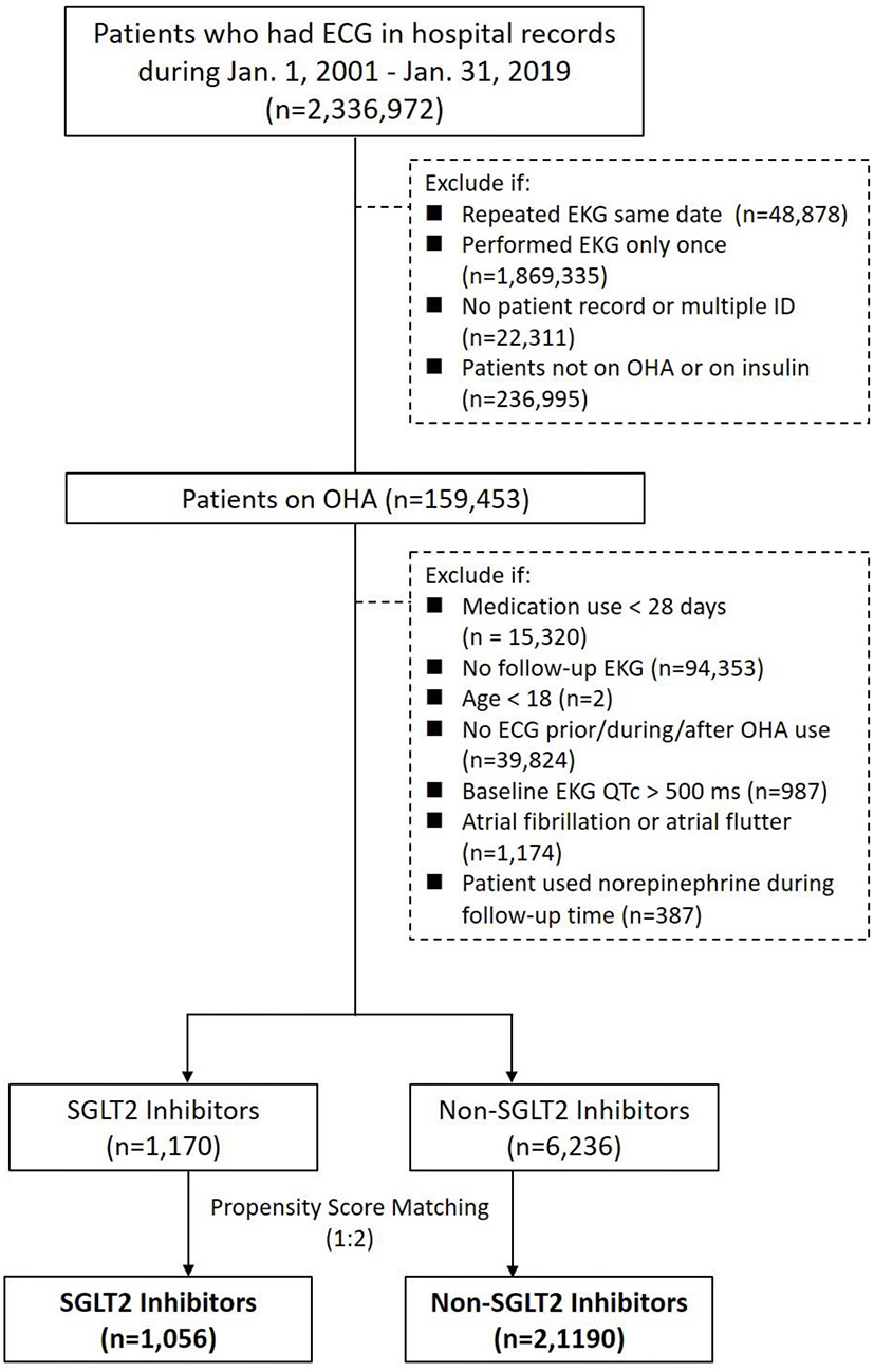 Electronic medical records from Chang Gung Research Database between January 1, 2001 and January 31, 2019 were searched for patients with ECG reports and patients on an oral hypoglycemic agent (OHA). We then separate these T2DM patients with EKG into those taking either SGLT2 inhibitors or non-SGLT2 inhibitors. We excluded patients with OHA use <28 days, age <18 years, baseline ECG QTc > 500 ms, and ECG showing atrial fibrillation or atrial flutter. Propensity score matching (PSM) was performed between groups by age, sex, comorbidities, and medications (including QT prolonging medications). Conditional logistic regression and Firth's logistic regression for rare events were employed to compare the difference between SGLT2 and non-SGLT2 inhibitor patients.