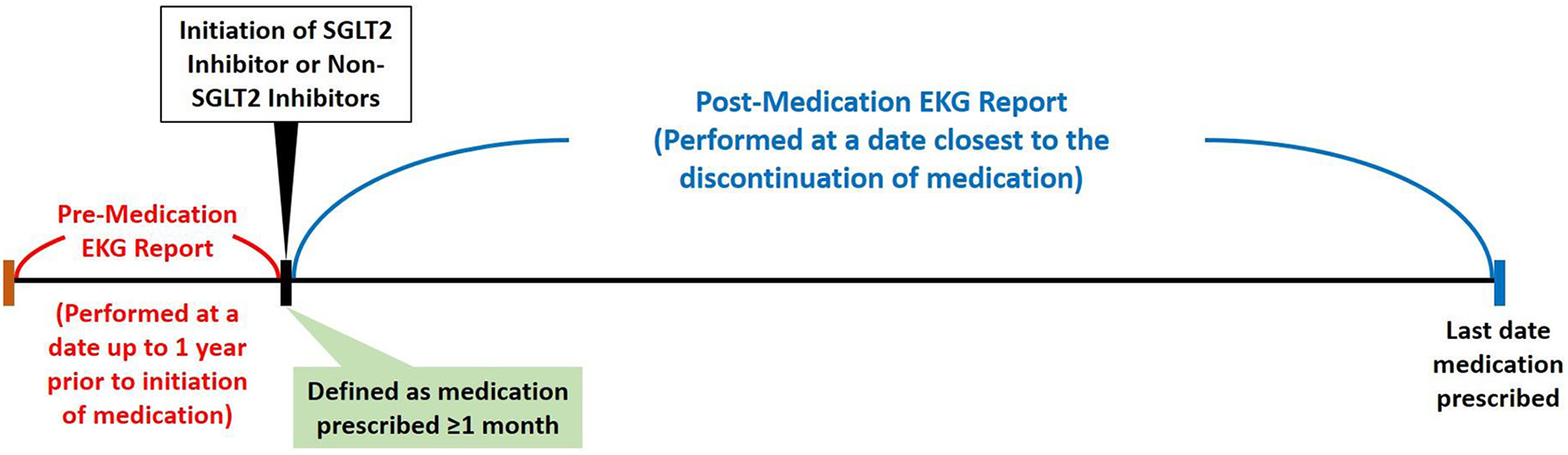By searching electronic medical records from the Chang Gung Research Database (CGRD) between January 1, 2001 and January 31, 2019, we retrieved patient records with electrocardiogram (ECG). We excluded patients with repeated ECG on the same date, had ECG only once, ECG linked to no or multiple hospital identification, and patients not on oral hypoglycemic agent (OHA) or on insulin. We then separate these patients with T2DM and records of ECG into either the group on SGLT2 inhibitors or the group on non-SGLT2 inhibitors. Within each group, we excluded patients that had OHA use <28 days, age <18 years, no ECG prior, during, after OHA use, baseline ECG QTc >500 ms, and ECG showing atrial fibrillation or atrial flutter. Propensity score matching was performed between groups by age, sex, comorbidities, and medications (including QT prolonging medications) (Figure 1). The patients with T2DM enrolled, therefore, had at least 28 days of use of OHA, and we compared the ECGs prior to the use and after the use of OHA such that the first ECG was performed within 1 year prior to the use of OHA and second ECG was performed during the use of OHA (Figure 2).