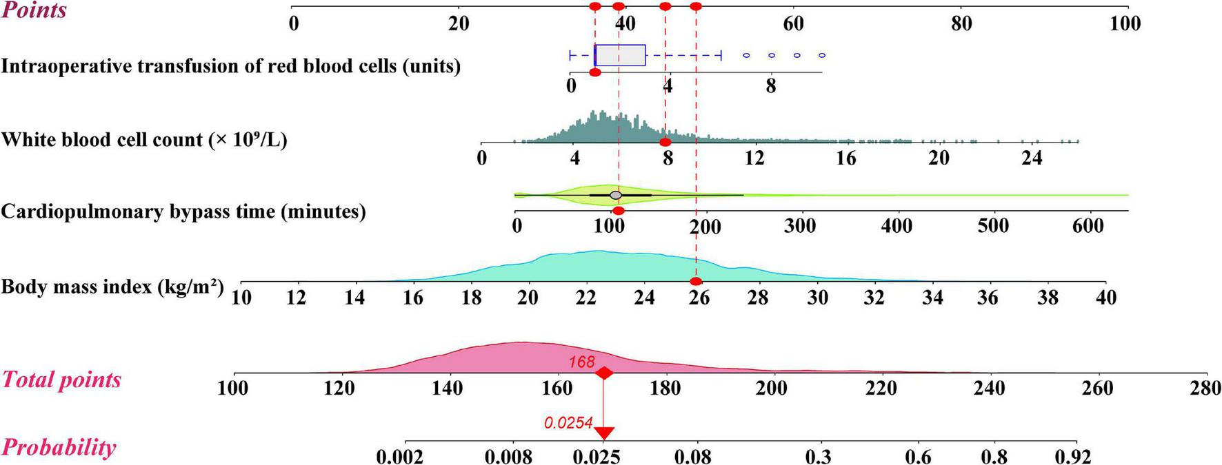 To test whether continuous variables were distributed normally, Kolmogorov–Smirnov tests were used. Continuous variables were expressed as means ± standard deviations (SDs) for normally distributed variables and as medians with interquartile ranges (IQRs) for skewed variables. Categorical variables were presented as counts and percentages. A univariate analysis was conducted first to screen for potential risk factors. Student’s t-test and Mann–Whitney U-test were applied to continuous variables. The chi-square test and Fisher’s exact test were applied to categorical variables. Then, a forward stepwise multivariate logistic regression analysis was conducted to identify independent risk factors for SH after cardiac surgery. An odds ratio (OR) with a 95% confidence interval (CI) was calculated. Model selection statistics were applied to help determine the most parsimonious final model considering the discrimination, calibration, and simplicity. A nomogram and a web-based risk calculator were constructed based on the final model.